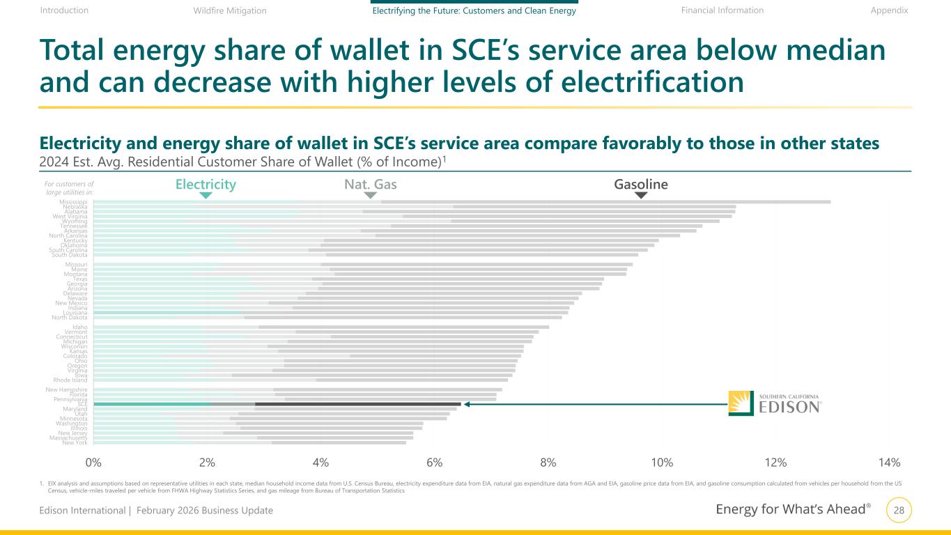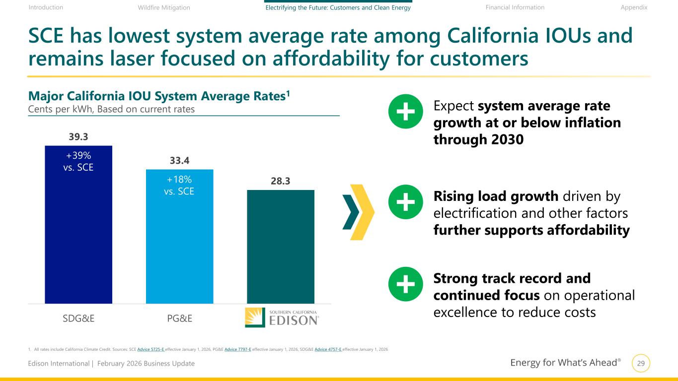 28Edison International | February 2026 Business Update Financial Information AppendixIntroduction Wildfire Mitigation Electrifying the Future: Customers and Clean Energy 0% 2% 4% 6% 8% 10% 12% 14% Mississippi Nebraska Alabama West Virginia Wyoming Tennessee Arkansas North Carolina Kentucky Oklahoma South Carolina South Dakota Missouri Maine Montana Texas Georgia Arizona Delaware Nevada New Mexico Indiana Louisiana North Dakota Idaho Vermont Connecticut Michigan Wisconsin Kansas Colorado Ohio Oregon Virginia Iowa Rhode Island New Hampshire Florida Pennsylvania SCE Maryland Utah Minnesota Washington Illinois New Jersey Massachusetts New York Total energy share of wallet in SCE’s service area below median and can decrease with higher levels of electrification 2024 Est. Avg. Residential Customer Share of Wallet (% of Income)1 Electricity Nat. Gas GasolineFor customers of large utilities in: Electricity and energy share of wallet in SCE’s service area compare favorably to those in other states 1. EIX analysis and assumptions based on representative utilities in each state, median household income data from U.S. Census Bureau, electricity expenditure data from EIA, natural gas expenditure data from AGA and EIA, gasoline price data from EIA, and gasoline consumption calculated from vehicles per household from the US Census, vehicle-miles traveled per vehicle from FHWA Highway Statistics Series, and gas mileage from Bureau of Transportation Statistics