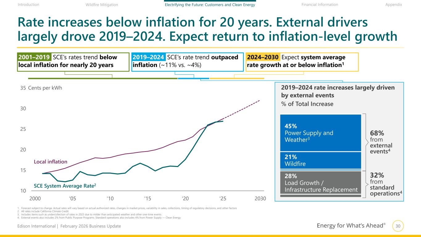 29Edison International | February 2026 Business Update Financial Information AppendixIntroduction Wildfire Mitigation Electrifying the Future: Customers and Clean Energy 39.3 33.4 28.3 SDG&E PG&E SCE SCE has lowest system average rate among California IOUs and remains laser focused on affordability for customers Major California IOU System Average Rates1 Cents per kWh, Based on current rates 1. All rates include California Climate Credit. Sources: SCE Advice 5725-E effective January 1, 2026, PG&E Advice 7797-E effective January 1, 2026, SDG&E Advice 4757-E effective January 1, 2026 Expect system average rate growth at or below inflation through 2030 Rising load growth driven by electrification and other factors further supports affordability Strong track record and continued focus on operational excellence to reduce costs +39% vs. SCE +18% vs. SCE