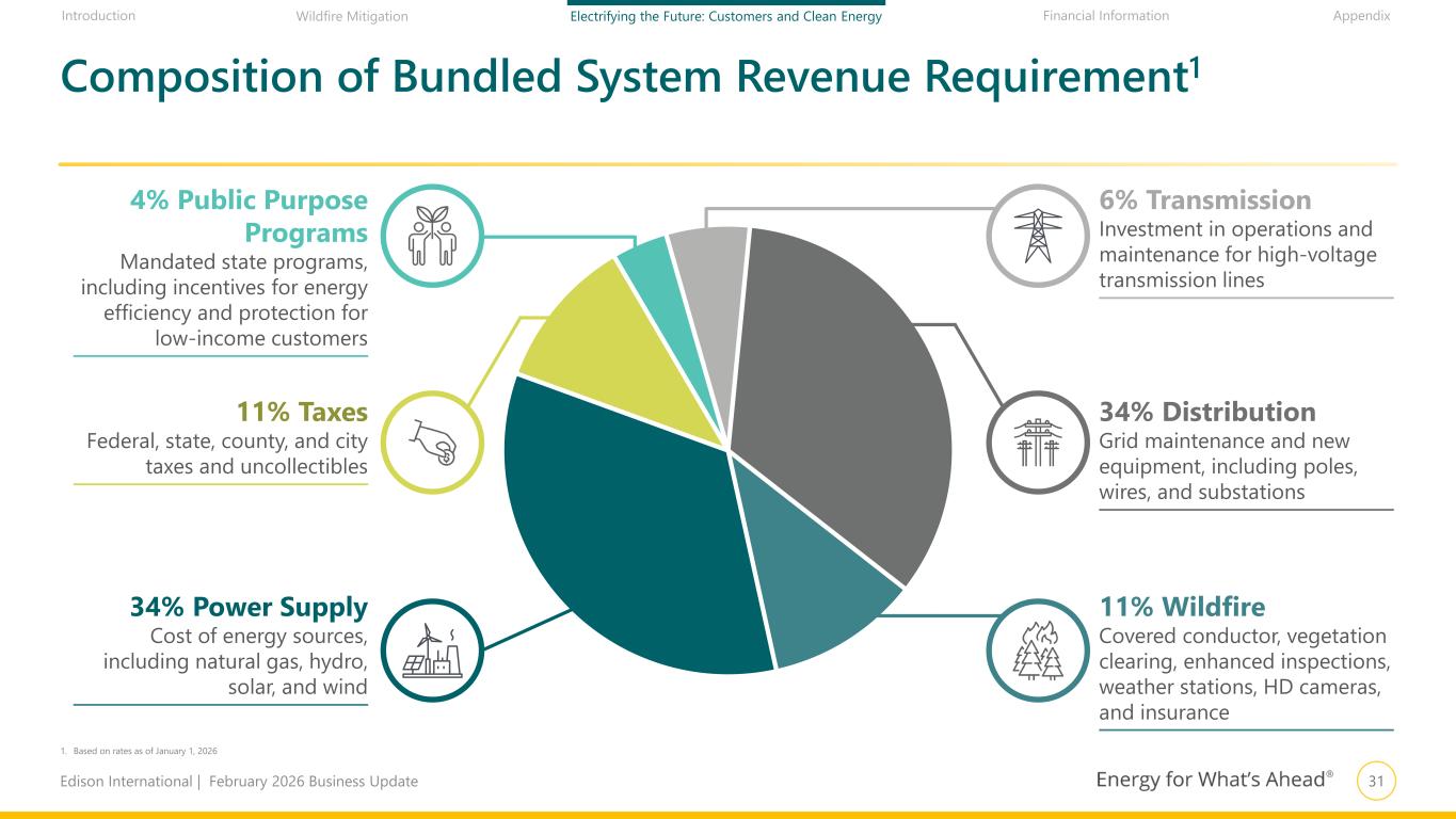30Edison International | February 2026 Business Update Financial Information AppendixIntroduction Wildfire Mitigation Electrifying the Future: Customers and Clean Energy 10 15 20 25 30 35 2000 '05 '10 '15 '20 '25 2030 2019–2024 rate increases largely driven by external events % of Total Increase 2019–2024: SCE’s rate trend outpaced inflation (~11% vs. ~4%) Rate increases below inflation for 20 years. External drivers largely drove 2019–2024. Expect return to inflation-level growth 2001–2019 SCE’s rates trend below local inflation for nearly 20 years SCE System Average Rate2 Local inflation 68% from external events4 Cents per kWh 1. Forecast subject to change. Actual rates will vary based on actual authorized rates, changes in market prices, variability in sales, collections, timing of regulatory decisions, and other factors 2. All rates include California Climate Credit 3. Includes items such as undercollection of rates in 2023 due to milder than anticipated weather and other one-time events 4. External events also includes 2% from Public Purpose Programs. Standard operations also includes 4% from Power Supply — Clean Energy 32% from standard operations4 21% Wildfire 45% Power Supply and Weather3 28% Load Growth / Infrastructure Replacement 2024–2028 Expect system average rate growth at or below inflation1 30
