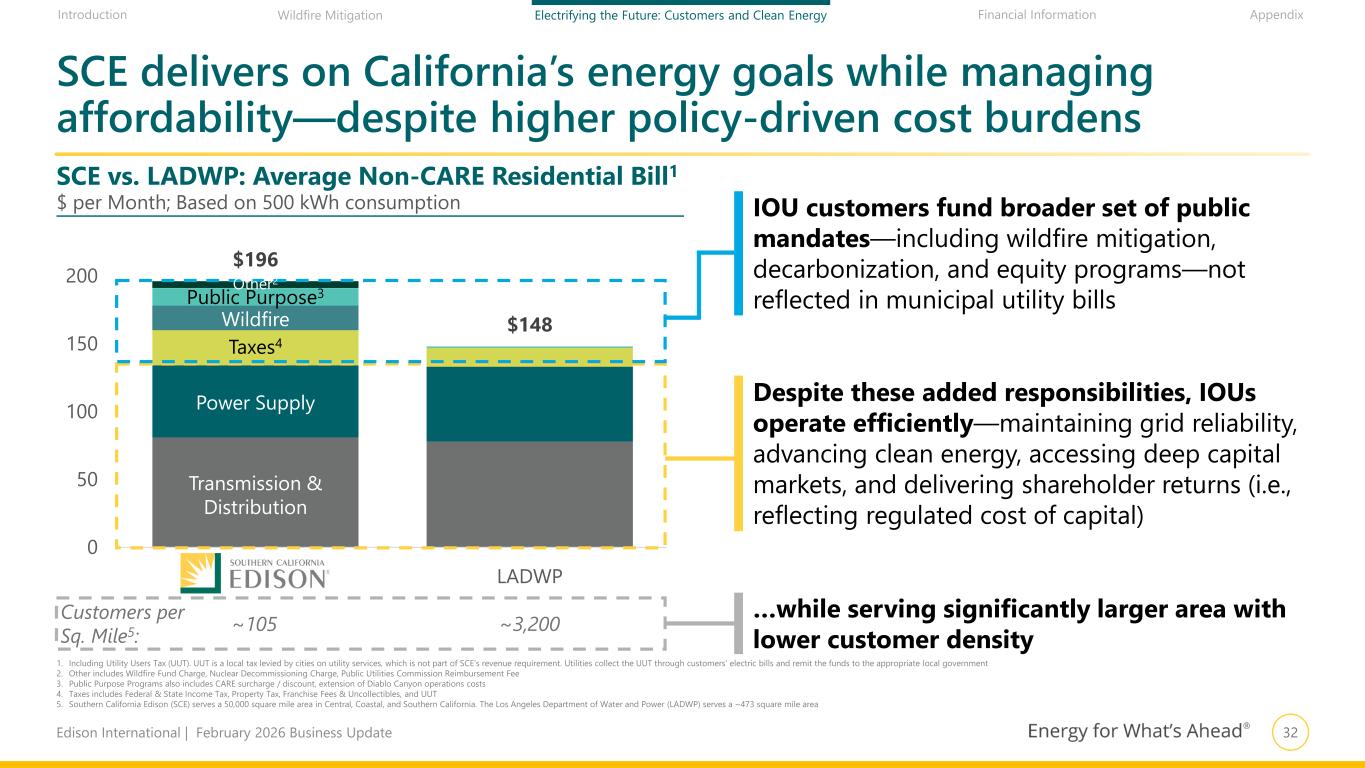 31Edison International | February 2026 Business Update Financial Information AppendixIntroduction Wildfire Mitigation Electrifying the Future: Customers and Clean Energy Composition of Bundled System Revenue Requirement1 6% Transmission Investment in operations and maintenance for high-voltage transmission lines 34% Distribution Grid maintenance and new equipment, including poles, wires, and substations 11% Wildfire Covered conductor, vegetation clearing, enhanced inspections, weather stations, HD cameras, and insurance 4% Public Purpose Programs Mandated state programs, including incentives for energy efficiency and protection for low-income customers 11% Taxes Federal, state, county, and city taxes and uncollectibles 34% Power Supply Cost of energy sources, including natural gas, hydro, solar, and wind 1. Based on rates as of January 1, 2026