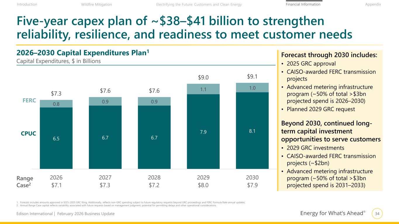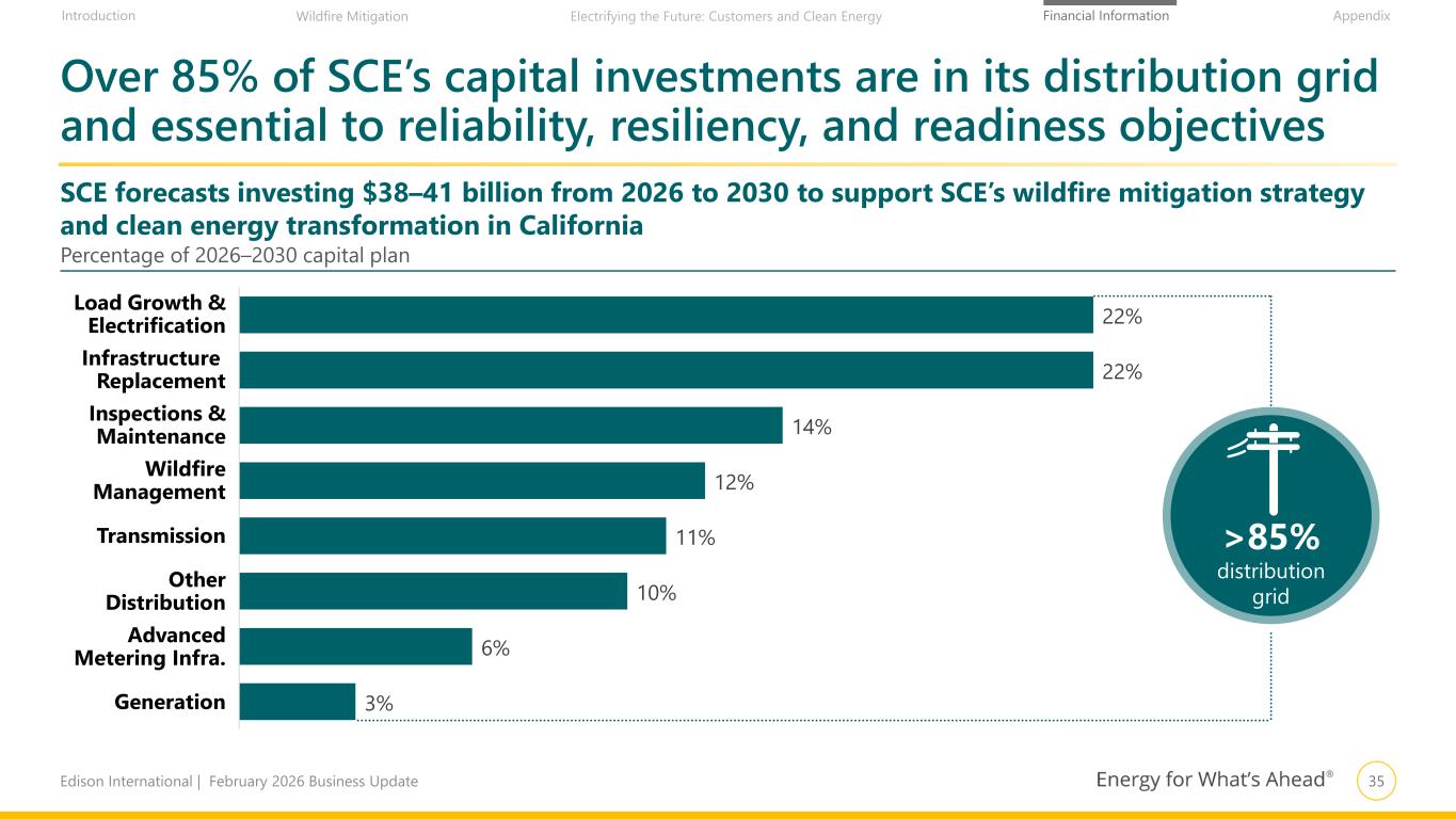 34Edison International | February 2026 Business Update Financial Information AppendixIntroduction Wildfire Mitigation Electrifying the Future: Customers and Clean Energy 2026–2030 Capital Expenditures Plan1 Five-year capex plan of ~$38–$41 billion to strengthen reliability, resilience, and readiness to meet customer needs Capital Expenditures, $ in Billions 1. Forecast includes amounts approved in SCE’s 2025 GRC filing. Additionally, reflects non-GRC spending subject to future regulatory requests beyond GRC proceedings and FERC Formula Rate annual updates. 2. Annual Range Case capital reflects variability associated with future requests based on management judgment, potential for permitting delays and other operational considerations 6.5 6.7 6.7 7.9 8.1 0.8 0.9 0.9 1.1 1.0 $7.3 $7.6 $7.6 $9.0 $9.1 2026 2027 2028 2029 2030 CPUC FERC Range Case2 $7.1 $7.3 $7.2 $8.0 $7.9 Forecast through 2030 includes: • 2025 GRC approval • CAISO-awarded FERC transmission projects • Advanced metering infrastructure program (~50% of total >$3bn projected spend is 2026–2030) • Planned 2029 GRC request Beyond 2030, continued long- term capital investment opportunities to serve customers • 2029 GRC investments • CAISO-awarded FERC transmission projects (~$2bn) • Advanced metering infrastructure program (~50% of total >$3bn projected spend is 2031–2033)
