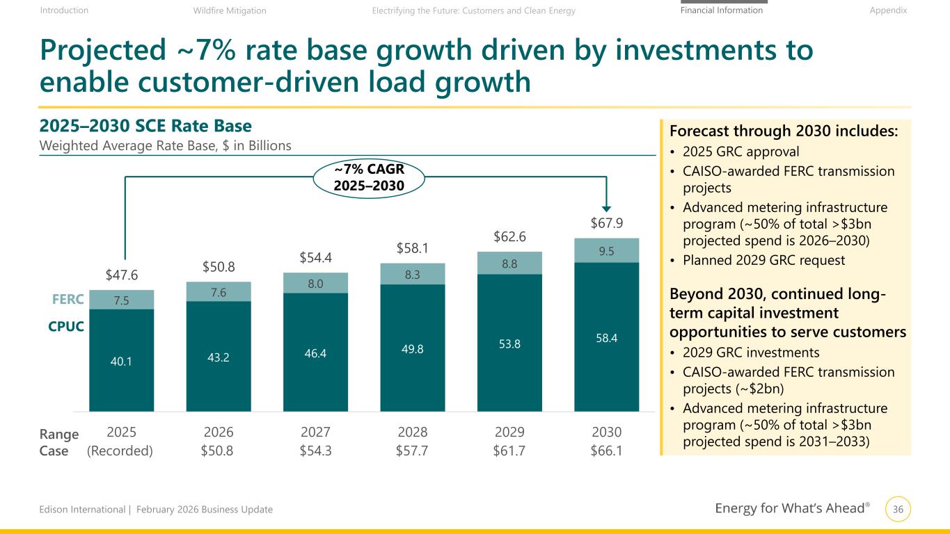 35Edison International | February 2026 Business Update Financial Information AppendixIntroduction Wildfire Mitigation Electrifying the Future: Customers and Clean Energy 22% 22% 14% 12% 11% 10% 6% 3% Load Growth & Electrification Infrastructure Replacement Inspections & Maintenance Wildfire Management Transmission Other Distribution Advanced Metering Infra. Generation Over 85% of SCE’s capital investments are in its distribution grid and essential to reliability, resiliency, and readiness objectives >85% distribution grid SCE forecasts investing $38–41 billion from 2026 to 2030 to support SCE’s wildfire mitigation strategy and clean energy transformation in California Percentage of 2026–2030 capital plan