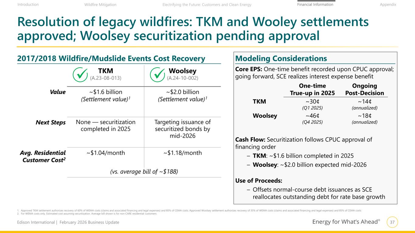 37Edison International | February 2026 Business Update Financial Information AppendixIntroduction Wildfire Mitigation Electrifying the Future: Customers and Clean Energy Resolution of legacy wildfires: TKM and Wooley settlements approved; Woolsey securitization pending approval TKM (A.23-08-013) Woolsey (A.24-10-002) Value ~$1.6 billion (Settlement value)1 ~$2.0 billion (Settlement value)1 Next Steps None — securitization completed in 2025 Targeting issuance of securitized bonds by mid-2026 Avg. Residential Customer Cost2 ~$1.04/month ~$1.18/month (vs. average bill of ~$188) Modeling Considerations2017/2018 Wildfire/Mudslide Events Cost Recovery 1. Approved TKM settlement authorizes recovery of 60% of WEMA costs (claims and associated financing and legal expenses) and 85% of CEMA costs. Approved Woolsey settlement authorizes recovery of 35% of WEMA costs (claims and associated financing and legal expenses) and 85% of CEMA costs 2. For WEMA costs only. Estimated cost assuming securitization. Average bill shown is for non-CARE residential customers Core EPS: One-time benefit recorded upon CPUC approval; going forward, SCE realizes interest expense benefit Cash Flow: Securitization follows CPUC approval of financing order – TKM: ~$1.6 billion completed in 2025 – Woolsey: ~$2.0 billion expected mid-2026 Use of Proceeds: – Offsets normal-course debt issuances as SCE reallocates outstanding debt for rate base growth One-time True-up in 2025 Ongoing Post-Decision TKM ~30¢ (Q1 2025) ~14¢ (annualized) Woolsey ~46¢ (Q4 2025) ~18¢ (annualized)