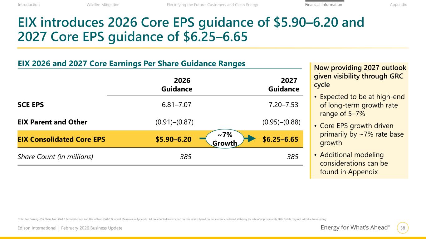 38Edison International | February 2026 Business Update Financial Information AppendixIntroduction Wildfire Mitigation Electrifying the Future: Customers and Clean Energy Note: See Earnings Per Share Non-GAAP Reconciliations and Use of Non-GAAP Financial Measures in Appendix. All tax-effected information on this slide is based on our current combined statutory tax rate of approximately 28%. Totals may not add due to rounding EIX 2026 and 2027 Core Earnings Per Share Guidance Ranges 2026 Guidance 2027 Guidance SCE EPS 6.81–7.07 7.20–7.53 EIX Parent and Other (0.91)–(0.87) (0.95)–(0.88) EIX Consolidated Core EPS $5.90–6.20 $6.25–6.65 Share Count (in millions) 385 385 EIX introduces 2026 Core EPS guidance of $5.90–6.20 and 2027 Core EPS guidance of $6.25–6.65 ~7% Growth Now providing 2027 outlook given visibility through GRC cycle • Expected to be at high-end of long-term growth rate range of 5–7% • Core EPS growth driven primarily by ~7% rate base growth • Additional modeling considerations can be found in Appendix