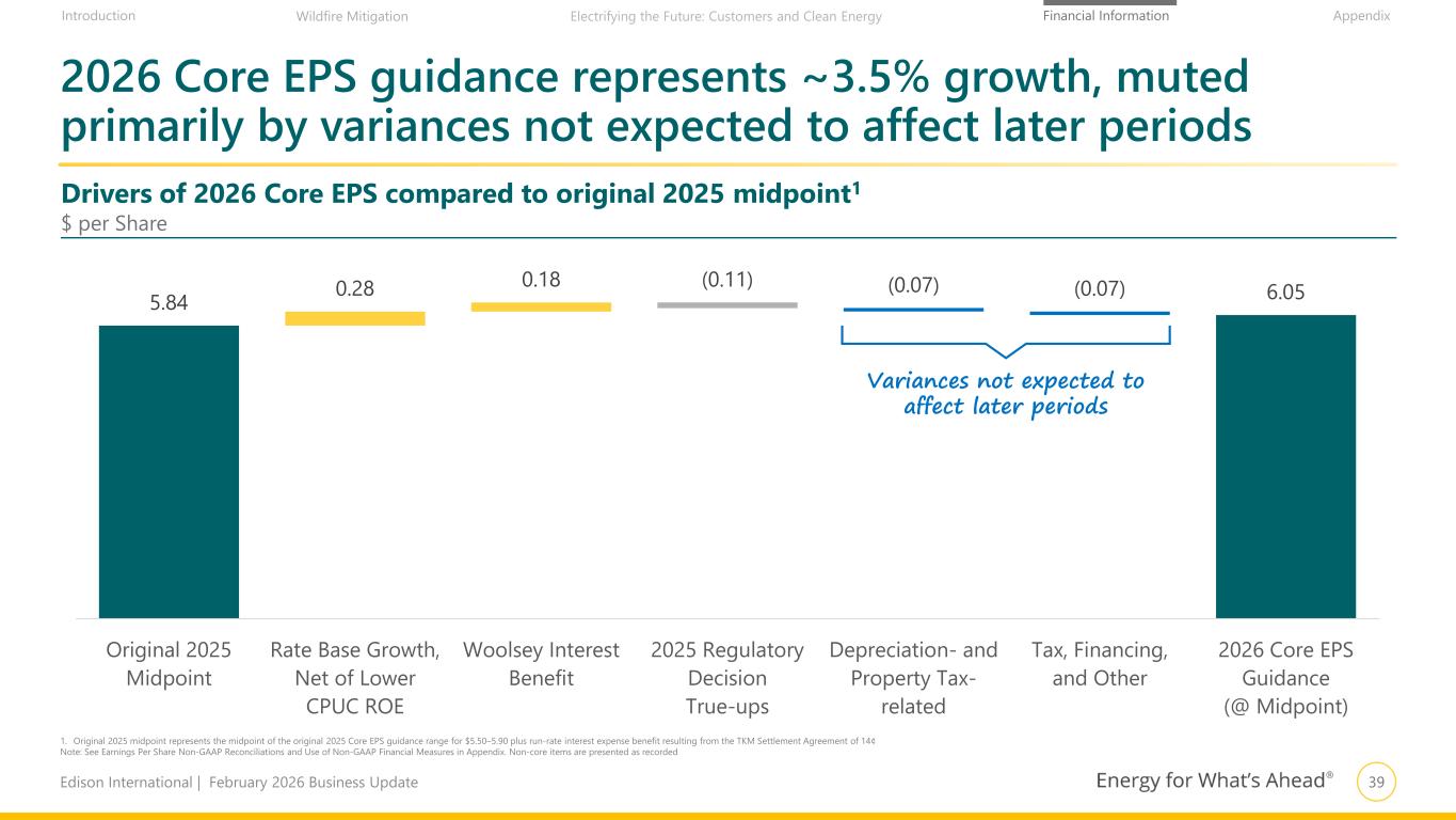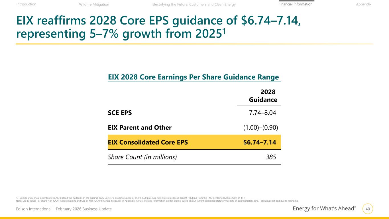 39Edison International | February 2026 Business Update Financial Information AppendixIntroduction Wildfire Mitigation Electrifying the Future: Customers and Clean Energy 5.84 0.28 0.18 (0.11) (0.07) (0.07) 6.05 Original 2025 Midpoint Rate Base Growth, Net of Lower CPUC ROE Woolsey Interest Benefit 2025 Regulatory Decision True-ups Depreciation- and Property Tax- related Tax, Financing, and Other 2026 Core EPS Guidance (@ Midpoint) 2026 Core EPS guidance represents ~3.5% growth, muted primarily by variances not expected to affect later periods Drivers of 2026 Core EPS compared to original 2025 midpoint1 $ per Share 1. Original 2025 midpoint represents the midpoint of the original 2025 Core EPS guidance range for $5.50–5.90 plus run-rate interest expense benefit resulting from the TKM Settlement Agreement of 14¢ Note: See Earnings Per Share Non-GAAP Reconciliations and Use of Non-GAAP Financial Measures in Appendix. Non-core items are presented as recorded Variances not expected to affect later periods
