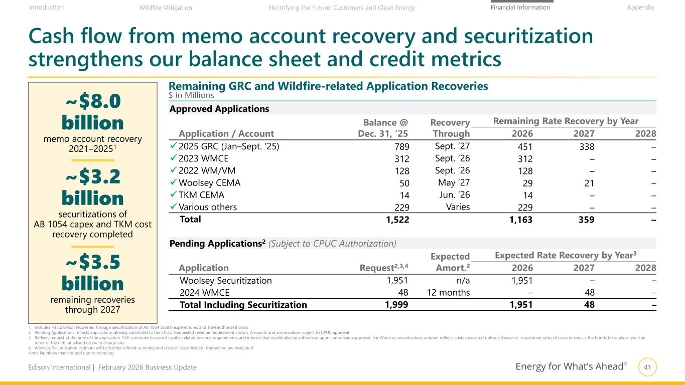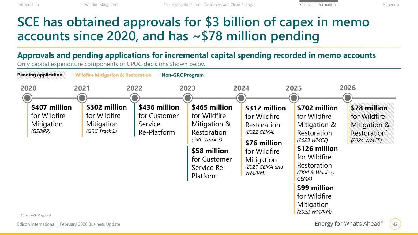 41Edison International | February 2026 Business Update Financial Information AppendixIntroduction Wildfire Mitigation Electrifying the Future: Customers and Clean Energy ~$8.0 billion memo account recovery 2021–20251 ~$3.2 billion securitizations of AB 1054 capex and TKM cost recovery completed ~$3.5 billion remaining recoveries through 2027 Cash flow from memo account recovery and securitization strengthens our balance sheet and credit metrics Approved Applications Application / Account Balance @ Dec. 31, ’25 Recovery Through Remaining Rate Recovery by Year 2026 2027 2028 2025 GRC (Jan–Sept. ’25) 789 Sept. ‘27 451 338 – 2023 WMCE 312 Sept. ‘26 312 – – 2022 WM/VM 128 Sept. ‘26 128 – – Woolsey CEMA 50 May ‘27 29 21 – TKM CEMA 14 Jun. ‘26 14 – – Various others 229 Varies 229 – – Total 1,522 1,163 359 – Pending Applications2 (Subject to CPUC Authorization) Application Request2,3,4 Expected Amort.2 Expected Rate Recovery by Year3 2026 2027 2028 Woolsey Securitization 1,951 n/a 1,951 – – 2024 WMCE 48 12 months – 48 – Total Including Securitization 1,999 1,951 48 – 1. Includes ~$3.2 billion recovered through securitization of AB 1054 capital expenditures and TKM authorized costs 2. Pending Applications reflects applications already submitted to the CPUC. Requested revenue requirement shown. Amounts and amortization subject to CPUC approval 3. Reflects request at the time of the application. SCE continues to record capital-related revenue requirements and interest that would also be authorized upon commission approval. For Woolsey securitization, amount reflects costs recovered upfront. Recovery in customer rates of costs to service the bonds takes place over the tenor of the debt at a fixed recovery charge rate 4. Woolsey Securitization estimate will be further refined as timing and costs of securitization transaction are evaluated Note: Numbers may not add due to rounding Remaining GRC and Wildfire-related Application Recoveries $ in Millions