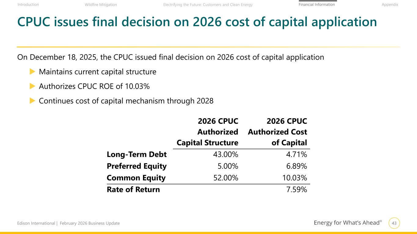 42Edison International | February 2026 Business Update Financial Information AppendixIntroduction Wildfire Mitigation Electrifying the Future: Customers and Clean Energy $78 million for Wildfire Mitigation & Restoration1 (2024 WMCE) $99 million for Wildfire Mitigation (2022 WM/VM) $702 million for Wildfire Mitigation & Restoration (2023 WMCE) $465 million for Wildfire Mitigation & Restoration (GRC Track 3) SCE has obtained approvals for $3 billion of capex in memo accounts since 2020, and has ~$78 million pending 202520242023202220212020 $407 million for Wildfire Mitigation (GS&RP) $302 million for Wildfire Mitigation (GRC Track 2) $436 million for Customer Service Re-Platform Approvals and pending applications for incremental capital spending recorded in memo accounts Only capital expenditure components of CPUC decisions shown below $58 million for Customer Service Re- Platform $312 million for Wildfire Restoration (2022 CEMA) $76 million for Wildfire Mitigation (2021 CEMA and WM/VM) $126 million for Wildfire Restoration (TKM & Woolsey CEMA) 2026 1. Subject to CPUC approval Pending application Wildfire Mitigation & Restoration Non-GRC Program