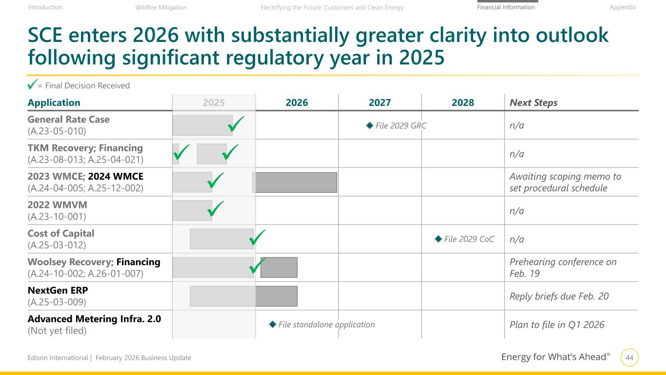44Edison International | February 2026 Business Update Financial Information AppendixIntroduction Wildfire Mitigation Electrifying the Future: Customers and Clean Energy SCE enters 2026 with substantially greater clarity into outlook following significant regulatory year in 2025 Application 2025 2026 2027 2028 Next Steps General Rate Case (A.23-05-010) n/a TKM Recovery; Financing (A.23-08-013; A.25-04-021) n/a 2023 WMCE; 2024 WMCE (A.24-04-005; A.25-12-002) Awaiting scoping memo to set procedural schedule 2022 WMVM (A.23-10-001) n/a Cost of Capital (A.25-03-012) n/a Woolsey Recovery; Financing (A.24-10-002; A.26-01-007) Prehearing conference on Feb. 19 NextGen ERP (A.25-03-009) Reply briefs due Feb. 20 Advanced Metering Infra. 2.0 (Not yet filed) Plan to file in Q1 2026 = Final Decision Received File 2029 GRC File 2029 CoC File standalone application