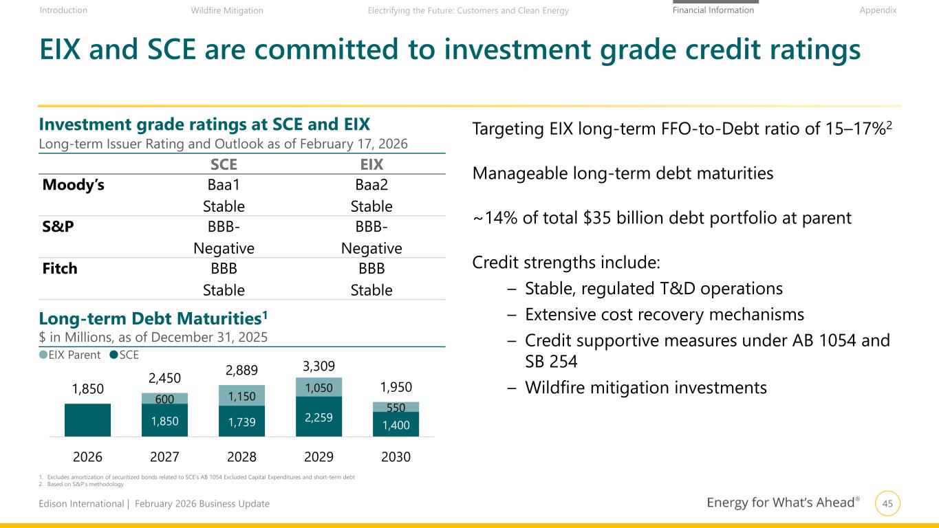 45Edison International | February 2026 Business Update Financial Information AppendixIntroduction Wildfire Mitigation Electrifying the Future: Customers and Clean Energy EIX and SCE are committed to investment grade credit ratings 1. Excludes amortization of securitized bonds related to SCE’s AB 1054 Excluded Capital Expenditures and short-term debt 2. Based on S&P’s methodology SCE EIX Moody’s Baa1 Stable Baa2 Stable S&P BBB- Negative BBB- Negative Fitch BBB Stable BBB Stable Targeting EIX long-term FFO-to-Debt ratio of 15–17%2 Manageable long-term debt maturities ~14% of total $35 billion debt portfolio at parent Credit strengths include: – Stable, regulated T&D operations – Extensive cost recovery mechanisms – Credit supportive measures under AB 1054 and SB 254 – Wildfire mitigation investments Investment grade ratings at SCE and EIX Long-term Issuer Rating and Outlook as of February 17, 2026 Long-term Debt Maturities1 $ in Millions, as of December 31, 2025 SCEEIX Parent 1,850 1,739 2,259 1,400 600 1,150 1,050 550 1,850 2,450 2,889 3,309 1,950 2026 2027 2028 2029 2030