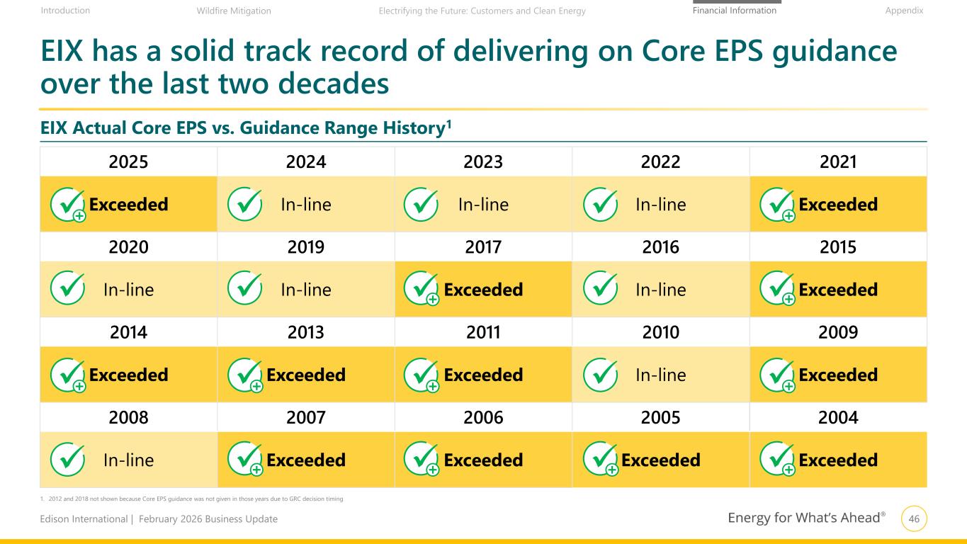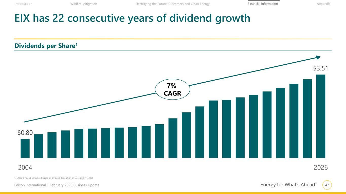 46Edison International | February 2026 Business Update Financial Information AppendixIntroduction Wildfire Mitigation Electrifying the Future: Customers and Clean Energy EIX has a solid track record of delivering on Core EPS guidance over the last two decades 2025 2024 2023 2022 2021 Exceeded In-line In-line In-line Exceeded 2020 2019 2017 2016 2015 In-line In-line Exceeded In-line Exceeded 2014 2013 2011 2010 2009 Exceeded Exceeded Exceeded In-line Exceeded 2008 2007 2006 2005 2004 In-line Exceeded Exceeded Exceeded Exceeded EIX Actual Core EPS vs. Guidance Range History1 1. 2012 and 2018 not shown because Core EPS guidance was not given in those years due to GRC decision timing + + ++ + + + + + + + +