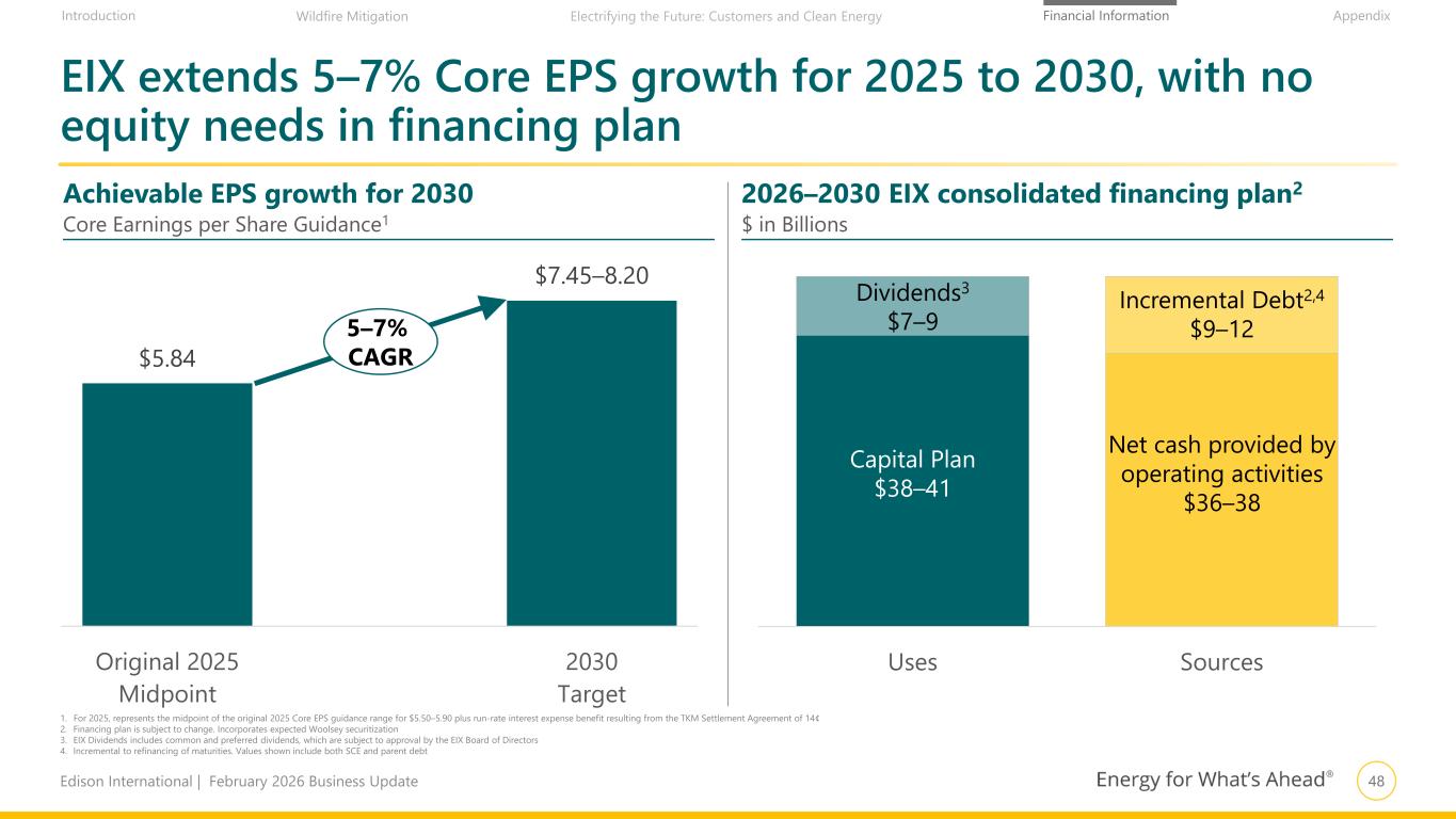 47Edison International | February 2026 Business Update Financial Information AppendixIntroduction Wildfire Mitigation Electrifying the Future: Customers and Clean Energy EIX has 22 consecutive years of dividend growth $0.80 $3.51 2004 2026 7% CAGR Dividends per Share1 1. 2026 dividend annualized based on dividend declaration on December 11, 2025