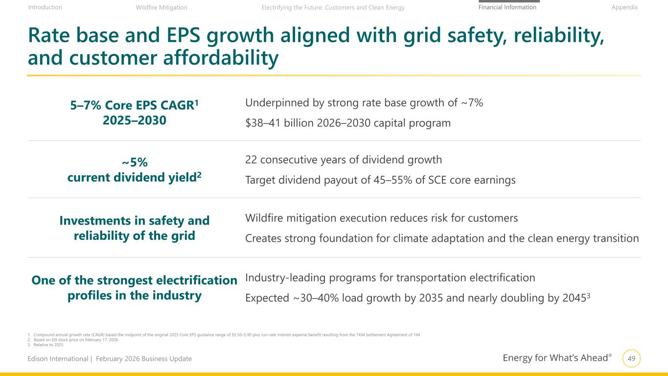 48Edison International | February 2026 Business Update Financial Information AppendixIntroduction Wildfire Mitigation Electrifying the Future: Customers and Clean Energy EIX extends 5–7% Core EPS growth for 2025 to 2030, with no equity needs in financing plan 1. For 2025, represents the midpoint of the original 2025 Core EPS guidance range for $5.50–5.90 plus run-rate interest expense benefit resulting from the TKM Settlement Agreement of 14¢ 2. Financing plan is subject to change. Incorporates expected Woolsey securitization 3. EIX Dividends includes common and preferred dividends, which are subject to approval by the EIX Board of Directors 4. Incremental to refinancing of maturities. Values shown include both SCE and parent debt $5.84 $7.45–8.20 Original 2025 Midpoint 2030 Target Achievable EPS growth for 2030 Core Earnings per Share Guidance1 5–7% CAGR 2026–2030 EIX consolidated financing plan2 $ in Billions Uses Sources Capital Plan $38–41 Dividends3 $7–9 Net cash provided by operating activities $36–38 Incremental Debt2,4 $9–12