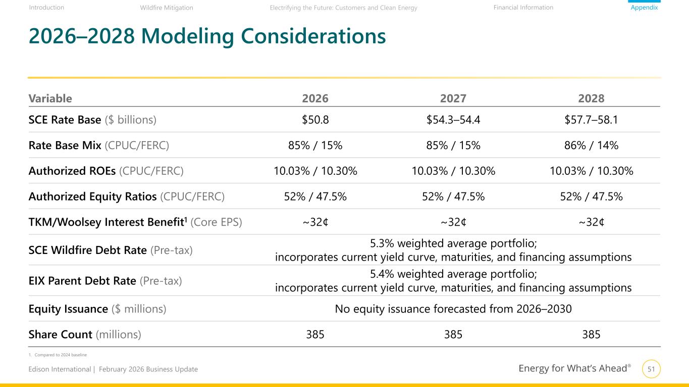 51Edison International | February 2026 Business Update AppendixIntroduction Financial InformationWildfire Mitigation Electrifying the Future: Customers and Clean Energy 2026–2028 Modeling Considerations Variable 2026 2027 2028 SCE Rate Base ($ billions) $50.8 $54.3–54.4 $57.7–58.1 Rate Base Mix (CPUC/FERC) 85% / 15% 85% / 15% 86% / 14% Authorized ROEs (CPUC/FERC) 10.03% / 10.30% 10.03% / 10.30% 10.03% / 10.30% Authorized Equity Ratios (CPUC/FERC) 52% / 47.5% 52% / 47.5% 52% / 47.5% TKM/Woolsey Interest Benefit1 (Core EPS) ~32¢ ~32¢ ~32¢ SCE Wildfire Debt Rate (Pre-tax) 5.3% weighted average portfolio; incorporates current yield curve, maturities, and financing assumptions EIX Parent Debt Rate (Pre-tax) 5.4% weighted average portfolio; incorporates current yield curve, maturities, and financing assumptions Equity Issuance ($ millions) No equity issuance forecasted from 2026–2030 Share Count (millions) 385 385 385 1. Compared to 2024 baseline