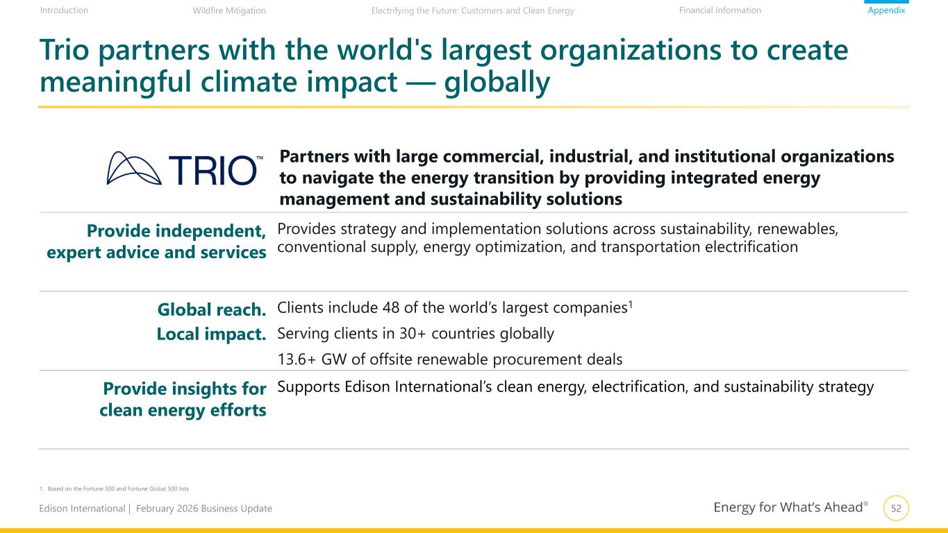 52Edison International | February 2026 Business Update AppendixIntroduction Financial InformationWildfire Mitigation Electrifying the Future: Customers and Clean Energy Partners with large commercial, industrial, and institutional organizations to navigate the energy transition by providing integrated energy management and sustainability solutions Provide independent, expert advice and services Provides strategy and implementation solutions across sustainability, renewables, conventional supply, energy optimization, and transportation electrification Global reach. Local impact. Clients include 48 of the world’s largest companies1 Serving clients in 30+ countries globally 13.6+ GW of offsite renewable procurement deals Provide insights for clean energy efforts Supports Edison International’s clean energy, electrification, and sustainability strategy Trio partners with the world's largest organizations to create meaningful climate impact — globally 1. Based on the Fortune 500 and Fortune Global 500 lists