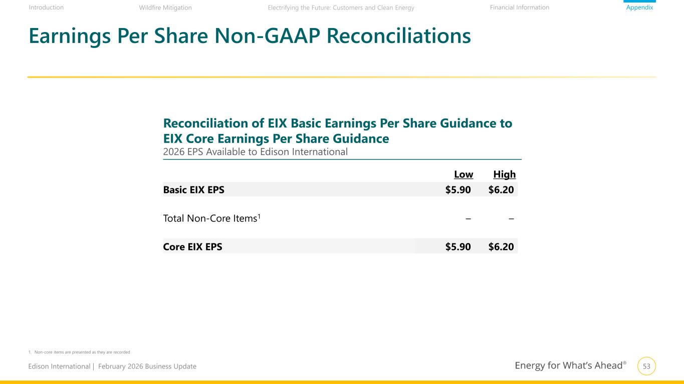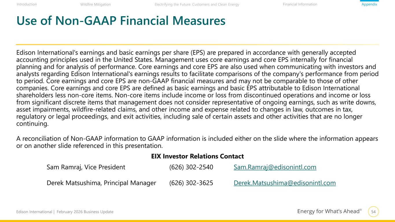 53Edison International | February 2026 Business Update AppendixIntroduction Financial InformationWildfire Mitigation Electrifying the Future: Customers and Clean Energy Low High Basic EIX EPS $5.90 $6.20 Total Non-Core Items1 – – Core EIX EPS $5.90 $6.20 1. Non-core items are presented as they are recorded Earnings Per Share Non-GAAP Reconciliations Reconciliation of EIX Basic Earnings Per Share Guidance to EIX Core Earnings Per Share Guidance 2026 EPS Available to Edison International