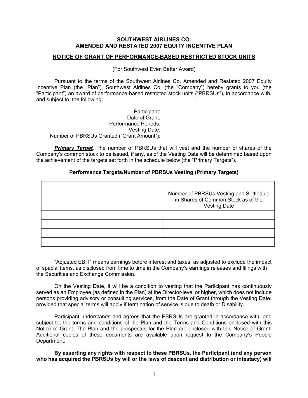 1 SOUTHWEST AIRLINES CO. AMENDED AND RESTATED 2007 EQUITY INCENTIVE PLAN NOTICE OF GRANT OF PERFORMANCE-BASED RESTRICTED STOCK UNITS (For Southwest Even Better Award) Pursuant to the terms of the Southwest Airlines Co. Amended and Restated 2007 Equity Incentive Plan (the “Plan”), Southwest Airlines Co. (the “Company”) hereby grants to you (the “Participant”) an award of performance-based restricted stock units (“PBRSUs”), in accordance with, and subject to, the following: Participant: Date of Grant: Performance Periods: Vesting Date: Number of PBRSUs Granted (“Grant Amount”): Primary Target. The number of PBRSUs that will vest and the number of shares of the Company’s common stock to be issued, if any, as of the Vesting Date will be determined based upon the achievement of the targets set forth in the schedule below (the “Primary Targets”). Performance Targets/Number of PBRSUs Vesting (Primary Targets) Number of PBRSUs Vesting and Settleable in Shares of Common Stock as of the Vesting Date “Adjusted EBIT” means earnings before interest and taxes, as adjusted to exclude the impact of special items, as disclosed from time to time in the Company’s earnings releases and filings with the Securities and Exchange Commission. On the Vesting Date, it will be a condition to vesting that the Participant has continuously served as an Employee (as defined in the Plan) at the Director-level or higher, which does not include persons providing advisory or consulting services, from the Date of Grant through the Vesting Date; provided that special terms will apply if termination of service is due to death or Disability. Participant understands and agrees that the PBRSUs are granted in accordance with, and subject to, the terms and conditions of the Plan and the Terms and Conditions enclosed with this Notice of Grant. The Plan and the prospectus for the Plan are enclosed with this Notice of Grant. Additional copies of these documents are available upon request to the Company’s People Department. By asserting any rights with respect to these PBRSUs, the Participant (and any person who has acquired the PBRSUs by will or the laws of descent and distribution or intestacy) will
