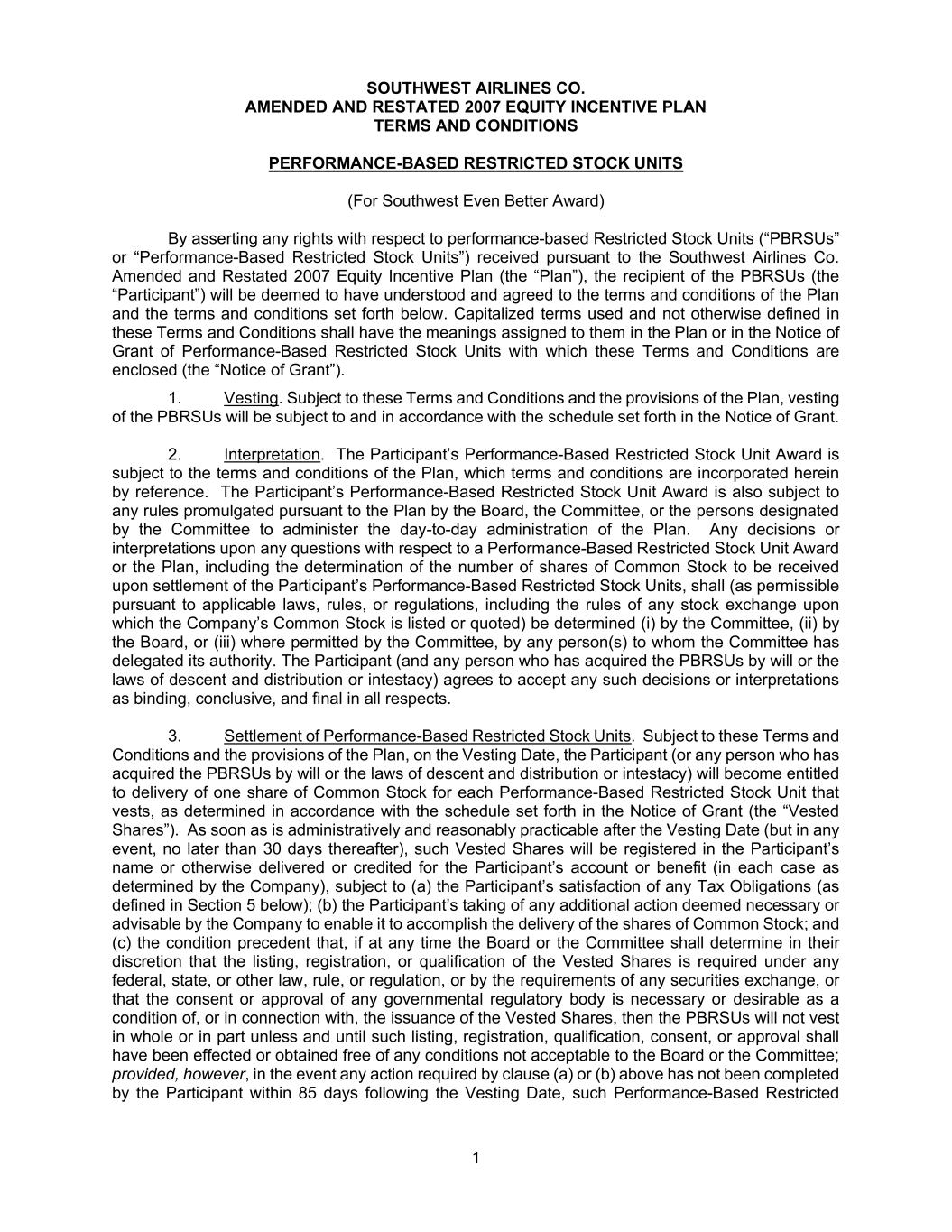 1 SOUTHWEST AIRLINES CO. AMENDED AND RESTATED 2007 EQUITY INCENTIVE PLAN TERMS AND CONDITIONS PERFORMANCE-BASED RESTRICTED STOCK UNITS (For Southwest Even Better Award) By asserting any rights with respect to performance-based Restricted Stock Units (“PBRSUs” or “Performance-Based Restricted Stock Units”) received pursuant to the Southwest Airlines Co. Amended and Restated 2007 Equity Incentive Plan (the “Plan”), the recipient of the PBRSUs (the “Participant”) will be deemed to have understood and agreed to the terms and conditions of the Plan and the terms and conditions set forth below. Capitalized terms used and not otherwise defined in these Terms and Conditions shall have the meanings assigned to them in the Plan or in the Notice of Grant of Performance-Based Restricted Stock Units with which these Terms and Conditions are enclosed (the “Notice of Grant”). 1. Vesting. Subject to these Terms and Conditions and the provisions of the Plan, vesting of the PBRSUs will be subject to and in accordance with the schedule set forth in the Notice of Grant. 2. Interpretation. The Participant’s Performance-Based Restricted Stock Unit Award is subject to the terms and conditions of the Plan, which terms and conditions are incorporated herein by reference. The Participant’s Performance-Based Restricted Stock Unit Award is also subject to any rules promulgated pursuant to the Plan by the Board, the Committee, or the persons designated by the Committee to administer the day-to-day administration of the Plan. Any decisions or interpretations upon any questions with respect to a Performance-Based Restricted Stock Unit Award or the Plan, including the determination of the number of shares of Common Stock to be received upon settlement of the Participant’s Performance-Based Restricted Stock Units, shall (as permissible pursuant to applicable laws, rules, or regulations, including the rules of any stock exchange upon which the Company’s Common Stock is listed or quoted) be determined (i) by the Committee, (ii) by the Board, or (iii) where permitted by the Committee, by any person(s) to whom the Committee has delegated its authority. The Participant (and any person who has acquired the PBRSUs by will or the laws of descent and distribution or intestacy) agrees to accept any such decisions or interpretations as binding, conclusive, and final in all respects. 3. Settlement of Performance-Based Restricted Stock Units. Subject to these Terms and Conditions and the provisions of the Plan, on the Vesting Date, the Participant (or any person who has acquired the PBRSUs by will or the laws of descent and distribution or intestacy) will become entitled to delivery of one share of Common Stock for each Performance-Based Restricted Stock Unit that vests, as determined in accordance with the schedule set forth in the Notice of Grant (the “Vested Shares”). As soon as is administratively and reasonably practicable after the Vesting Date (but in any event, no later than 30 days thereafter), such Vested Shares will be registered in the Participant’s name or otherwise delivered or credited for the Participant’s account or benefit (in each case as determined by the Company), subject to (a) the Participant’s satisfaction of any Tax Obligations (as defined in Section 5 below); (b) the Participant’s taking of any additional action deemed necessary or advisable by the Company to enable it to accomplish the delivery of the shares of Common Stock; and (c) the condition precedent that, if at any time the Board or the Committee shall determine in their discretion that the listing, registration, or qualification of the Vested Shares is required under any federal, state, or other law, rule, or regulation, or by the requirements of any securities exchange, or that the consent or approval of any governmental regulatory body is necessary or desirable as a condition of, or in connection with, the issuance of the Vested Shares, then the PBRSUs will not vest in whole or in part unless and until such listing, registration, qualification, consent, or approval shall have been effected or obtained free of any conditions not acceptable to the Board or the Committee; provided, however, in the event any action required by clause (a) or (b) above has not been completed by the Participant within 85 days following the Vesting Date, such Performance-Based Restricted