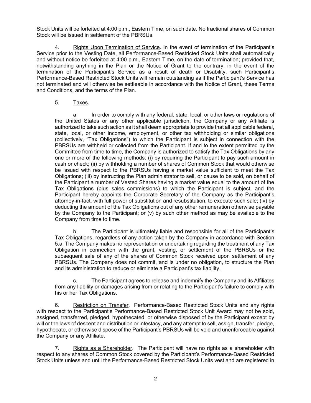 2 Stock Units will be forfeited at 4:00 p.m., Eastern Time, on such date. No fractional shares of Common Stock will be issued in settlement of the PBRSUs. 4. Rights Upon Termination of Service. In the event of termination of the Participant’s Service prior to the Vesting Date, all Performance-Based Restricted Stock Units shall automatically and without notice be forfeited at 4:00 p.m., Eastern Time, on the date of termination; provided that, notwithstanding anything in the Plan or the Notice of Grant to the contrary, in the event of the termination of the Participant’s Service as a result of death or Disability, such Participant’s Performance-Based Restricted Stock Units will remain outstanding as if the Participant’s Service has not terminated and will otherwise be settleable in accordance with the Notice of Grant, these Terms and Conditions, and the terms of the Plan. 5. Taxes. a. In order to comply with any federal, state, local, or other laws or regulations of the United States or any other applicable jurisdiction, the Company or any Affiliate is authorized to take such action as it shall deem appropriate to provide that all applicable federal, state, local, or other income, employment, or other tax withholding or similar obligations (collectively, “Tax Obligations”) to which the Participant is subject in connection with the PBRSUs are withheld or collected from the Participant. If and to the extent permitted by the Committee from time to time, the Company is authorized to satisfy the Tax Obligations by any one or more of the following methods: (i) by requiring the Participant to pay such amount in cash or check; (ii) by withholding a number of shares of Common Stock that would otherwise be issued with respect to the PBRSUs having a market value sufficient to meet the Tax Obligations; (iii) by instructing the Plan administrator to sell, or cause to be sold, on behalf of the Participant a number of Vested Shares having a market value equal to the amount of the Tax Obligations (plus sales commissions) to which the Participant is subject, and the Participant hereby appoints the Corporate Secretary of the Company as the Participant’s attorney-in-fact, with full power of substitution and resubstitution, to execute such sale; (iv) by deducting the amount of the Tax Obligations out of any other remuneration otherwise payable by the Company to the Participant; or (v) by such other method as may be available to the Company from time to time. b. The Participant is ultimately liable and responsible for all of the Participant’s Tax Obligations, regardless of any action taken by the Company in accordance with Section 5.a. The Company makes no representation or undertaking regarding the treatment of any Tax Obligation in connection with the grant, vesting, or settlement of the PBRSUs or the subsequent sale of any of the shares of Common Stock received upon settlement of any PBRSUs. The Company does not commit, and is under no obligation, to structure the Plan and its administration to reduce or eliminate a Participant’s tax liability. c. The Participant agrees to release and indemnify the Company and its Affiliates from any liability or damages arising from or relating to the Participant’s failure to comply with his or her Tax Obligations. 6. Restriction on Transfer. Performance-Based Restricted Stock Units and any rights with respect to the Participant’s Performance-Based Restricted Stock Unit Award may not be sold, assigned, transferred, pledged, hypothecated, or otherwise disposed of by the Participant except by will or the laws of descent and distribution or intestacy, and any attempt to sell, assign, transfer, pledge, hypothecate, or otherwise dispose of the Participant’s PBRSUs will be void and unenforceable against the Company or any Affiliate. 7. Rights as a Shareholder. The Participant will have no rights as a shareholder with respect to any shares of Common Stock covered by the Participant’s Performance-Based Restricted Stock Units unless and until the Performance-Based Restricted Stock Units vest and are registered in
