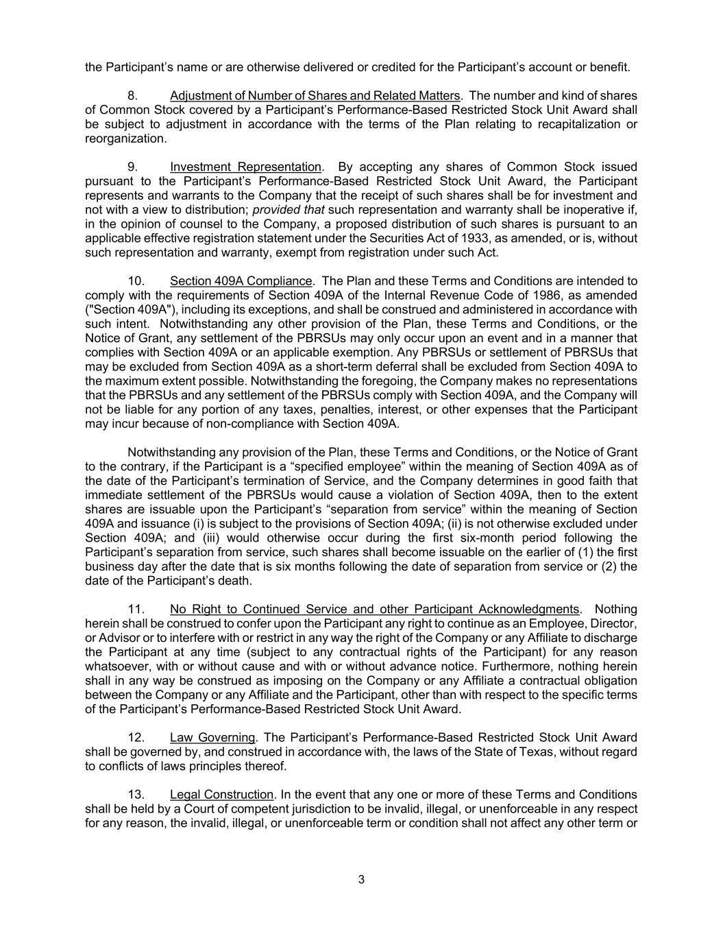 3 the Participant’s name or are otherwise delivered or credited for the Participant’s account or benefit. 8. Adjustment of Number of Shares and Related Matters. The number and kind of shares of Common Stock covered by a Participant’s Performance-Based Restricted Stock Unit Award shall be subject to adjustment in accordance with the terms of the Plan relating to recapitalization or reorganization. 9. Investment Representation. By accepting any shares of Common Stock issued pursuant to the Participant’s Performance-Based Restricted Stock Unit Award, the Participant represents and warrants to the Company that the receipt of such shares shall be for investment and not with a view to distribution; provided that such representation and warranty shall be inoperative if, in the opinion of counsel to the Company, a proposed distribution of such shares is pursuant to an applicable effective registration statement under the Securities Act of 1933, as amended, or is, without such representation and warranty, exempt from registration under such Act. 10. Section 409A Compliance. The Plan and these Terms and Conditions are intended to comply with the requirements of Section 409A of the Internal Revenue Code of 1986, as amended ("Section 409A"), including its exceptions, and shall be construed and administered in accordance with such intent. Notwithstanding any other provision of the Plan, these Terms and Conditions, or the Notice of Grant, any settlement of the PBRSUs may only occur upon an event and in a manner that complies with Section 409A or an applicable exemption. Any PBRSUs or settlement of PBRSUs that may be excluded from Section 409A as a short-term deferral shall be excluded from Section 409A to the maximum extent possible. Notwithstanding the foregoing, the Company makes no representations that the PBRSUs and any settlement of the PBRSUs comply with Section 409A, and the Company will not be liable for any portion of any taxes, penalties, interest, or other expenses that the Participant may incur because of non-compliance with Section 409A. Notwithstanding any provision of the Plan, these Terms and Conditions, or the Notice of Grant to the contrary, if the Participant is a “specified employee” within the meaning of Section 409A as of the date of the Participant’s termination of Service, and the Company determines in good faith that immediate settlement of the PBRSUs would cause a violation of Section 409A, then to the extent shares are issuable upon the Participant’s “separation from service” within the meaning of Section 409A and issuance (i) is subject to the provisions of Section 409A; (ii) is not otherwise excluded under Section 409A; and (iii) would otherwise occur during the first six-month period following the Participant’s separation from service, such shares shall become issuable on the earlier of (1) the first business day after the date that is six months following the date of separation from service or (2) the date of the Participant’s death. 11. No Right to Continued Service and other Participant Acknowledgments. Nothing herein shall be construed to confer upon the Participant any right to continue as an Employee, Director, or Advisor or to interfere with or restrict in any way the right of the Company or any Affiliate to discharge the Participant at any time (subject to any contractual rights of the Participant) for any reason whatsoever, with or without cause and with or without advance notice. Furthermore, nothing herein shall in any way be construed as imposing on the Company or any Affiliate a contractual obligation between the Company or any Affiliate and the Participant, other than with respect to the specific terms of the Participant’s Performance-Based Restricted Stock Unit Award. 12. Law Governing. The Participant’s Performance-Based Restricted Stock Unit Award shall be governed by, and construed in accordance with, the laws of the State of Texas, without regard to conflicts of laws principles thereof. 13. Legal Construction. In the event that any one or more of these Terms and Conditions shall be held by a Court of competent jurisdiction to be invalid, illegal, or unenforceable in any respect for any reason, the invalid, illegal, or unenforceable term or condition shall not affect any other term or