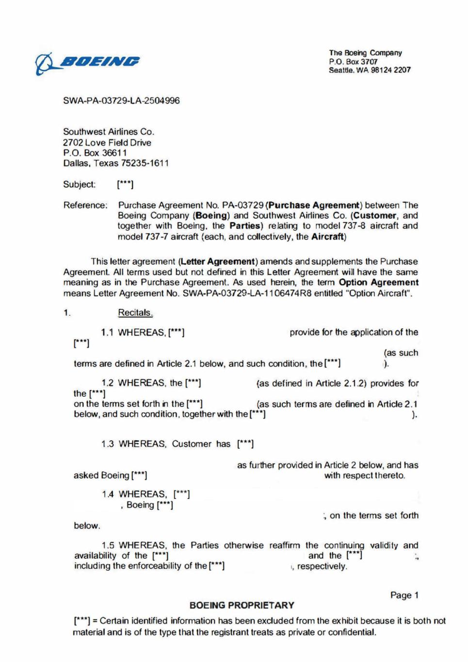 A__Arize7Arc SWA-PA-03729-LA-2504996 Southwest Airlines Co. 2702 Love Field Drive P.O. Box 36611 Dallas, Texas 75235-1611 Subject: ['] The Boeing Company P.O. Box 3707 Seattle, WA 98124 2207 Reference. Purchase Agreement No. PA-03729 (Purchase Agreement) between The Boeing Company (Boeing) and Southwest Airlines Co. (Customer, and together with Boeing, the Parties) relating to model 737-8 aircraft and model 737-7 aircraft (each, and collectively, the Aircraft) This letter agreement (Letter Agreement) amends and supplements the Purchase Agreement. All terms used but not defined in this Letter Agreement will have the same meaning as in the Purchase Agreement. As used herein, the term Option Agreement means Letter Agreement No. SWA-PA-03729-LA-1106474R8 entitled "Option Aircraft". 1. Recitals. 1.1 WHEREAS, [] provide for the application of the r (as such terms are defined in Article 2.1 below, and such condition, the [ ] 1.2 WHEREAS, the ['] (as defined in Article 2.1.2) provides for the [***] on the terms set forth in the ['] (as such terms are defined in Article 2.1 below, and such condition, together with the [***] ). 1.3 WHEREAS, Customer has E**1 as further provided in Article 2 below, and has asked Boeing [***] with respect thereto. 1.4 WHEREAS, ['] , Boeing [***] , on the terms set forth below. 1.5 WHEREAS, the Parties otherwise reaffirm the continuing validity and availability of the [***] and the [*"] including the enforceability of the ["] respectively. Page 1 BOEING PROPRIETARY ["*] = Certain identified information has been excluded from the exhibit because it is both not material and is of the type that the registrant treats as private or confidential.