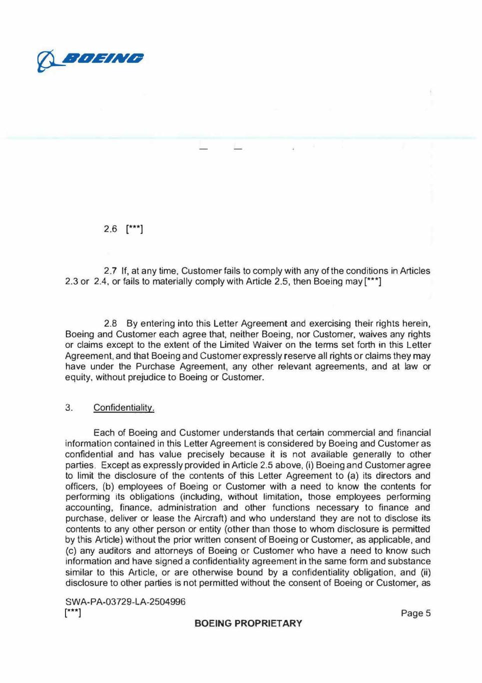 Z)CLAPPI7EZAMS? 2.6 [***] 2.7 If, at any time, Customer fails to comply with any of the conditions in Articles 2.3 or 2.4, or fails to materially comply with Article 2.5, then Boeing may [***] 2.8 By entering into this Letter Agreement and exercising their rights herein, Boeing and Customer each agree that, neither Boeing, nor Customer, waives any rights or claims except to the extent of the Limited Waiver on the terms set forth in this Letter Agreement, and that Boeing and Customer expressly reserve all rights or claims they may have under the Purchase Agreement, any other relevant agreements, and at law or equity, without prejudice to Boeing or Customer. 3. Confidentiality. Each of Boeing and Customer understands that certain commercial and financial information contained in this Letter Agreement is considered by Boeing and Customer as confidential and has value precisely because it is not available generally to other parties. Except as expressly provided in Article 2.5 above, (i) Boeing and Customer agree to limit the disclosure of the contents of this Letter Agreement to (a) its directors and officers, (b) employees of Boeing or Customer with a need to know the contents for performing its obligations (including, without limitation, those employees performing accounting, finance, administration and other functions necessary to finance and purchase, deliver or lease the Aircraft) and who understand they are not to disclose its contents to any other person or entity (other than those to whom disclosure is permitted by this Article) without the prior written consent of Boeing or Customer, as applicable, and (c) any auditors and attorneys of Boeing or Customer who have a need to know such information and have signed a confidentiality agreement in the same form and substance similar to this Article, or are otherwise bound by a confidentiality obligation, and (ii) disclosure to other parties is not permitted without the consent of Boeing or Customer, as SWA-PA-03729-LA-2504996 BOEING PROPRIETARY Page 5