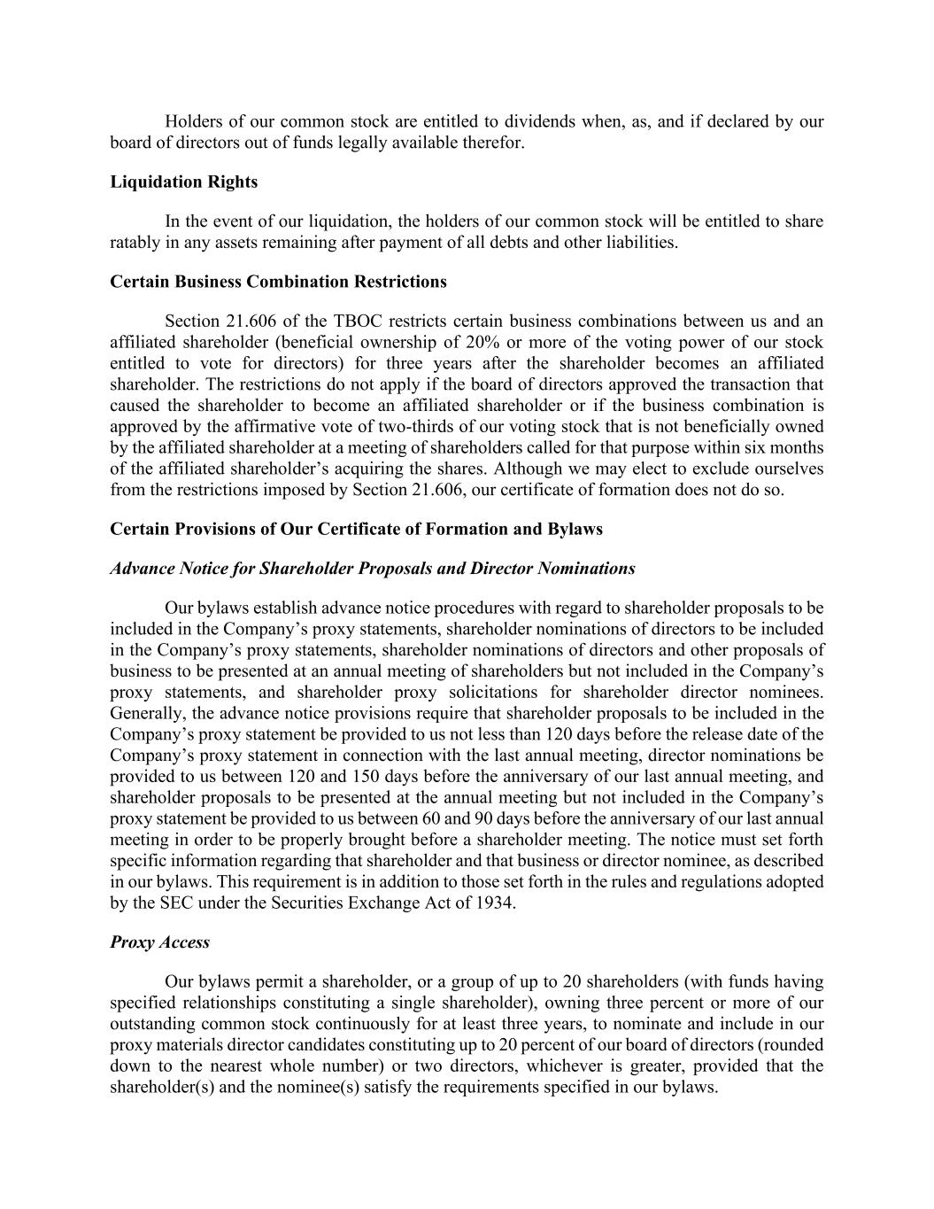 Holders of our common stock are entitled to dividends when, as, and if declared by our board of directors out of funds legally available therefor. Liquidation Rights In the event of our liquidation, the holders of our common stock will be entitled to share ratably in any assets remaining after payment of all debts and other liabilities. Certain Business Combination Restrictions Section 21.606 of the TBOC restricts certain business combinations between us and an affiliated shareholder (beneficial ownership of 20% or more of the voting power of our stock entitled to vote for directors) for three years after the shareholder becomes an affiliated shareholder. The restrictions do not apply if the board of directors approved the transaction that caused the shareholder to become an affiliated shareholder or if the business combination is approved by the affirmative vote of two-thirds of our voting stock that is not beneficially owned by the affiliated shareholder at a meeting of shareholders called for that purpose within six months of the affiliated shareholder’s acquiring the shares. Although we may elect to exclude ourselves from the restrictions imposed by Section 21.606, our certificate of formation does not do so. Certain Provisions of Our Certificate of Formation and Bylaws Advance Notice for Shareholder Proposals and Director Nominations Our bylaws establish advance notice procedures with regard to shareholder proposals to be included in the Company’s proxy statements, shareholder nominations of directors to be included in the Company’s proxy statements, shareholder nominations of directors and other proposals of business to be presented at an annual meeting of shareholders but not included in the Company’s proxy statements, and shareholder proxy solicitations for shareholder director nominees. Generally, the advance notice provisions require that shareholder proposals to be included in the Company’s proxy statement be provided to us not less than 120 days before the release date of the Company’s proxy statement in connection with the last annual meeting, director nominations be provided to us between 120 and 150 days before the anniversary of our last annual meeting, and shareholder proposals to be presented at the annual meeting but not included in the Company’s proxy statement be provided to us between 60 and 90 days before the anniversary of our last annual meeting in order to be properly brought before a shareholder meeting. The notice must set forth specific information regarding that shareholder and that business or director nominee, as described in our bylaws. This requirement is in addition to those set forth in the rules and regulations adopted by the SEC under the Securities Exchange Act of 1934. Proxy Access Our bylaws permit a shareholder, or a group of up to 20 shareholders (with funds having specified relationships constituting a single shareholder), owning three percent or more of our outstanding common stock continuously for at least three years, to nominate and include in our proxy materials director candidates constituting up to 20 percent of our board of directors (rounded down to the nearest whole number) or two directors, whichever is greater, provided that the shareholder(s) and the nominee(s) satisfy the requirements specified in our bylaws.