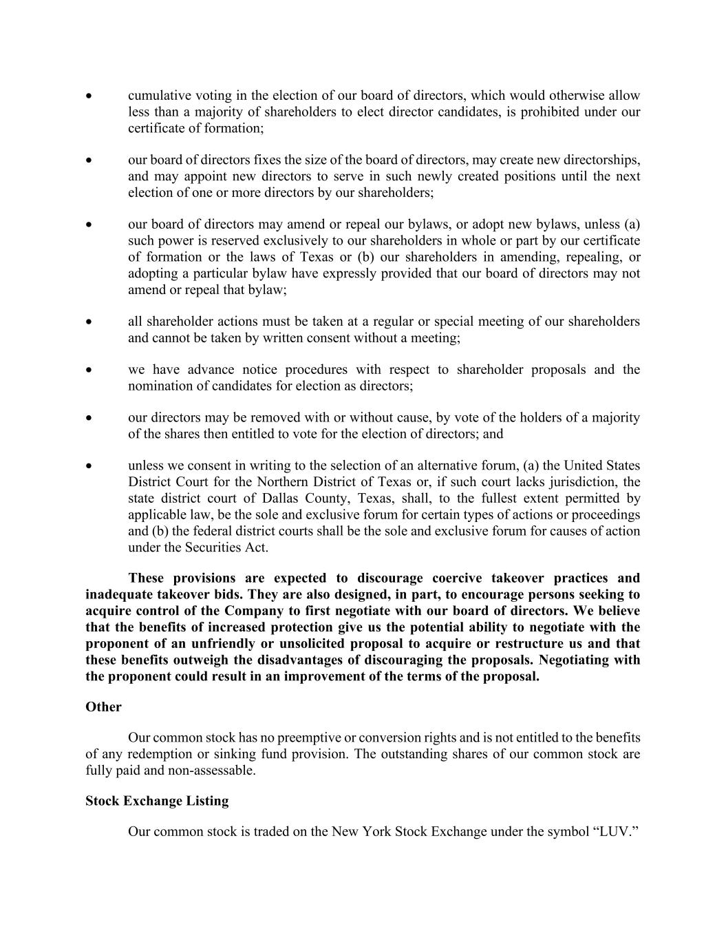 • cumulative voting in the election of our board of directors, which would otherwise allow less than a majority of shareholders to elect director candidates, is prohibited under our certificate of formation; • our board of directors fixes the size of the board of directors, may create new directorships, and may appoint new directors to serve in such newly created positions until the next election of one or more directors by our shareholders; • our board of directors may amend or repeal our bylaws, or adopt new bylaws, unless (a) such power is reserved exclusively to our shareholders in whole or part by our certificate of formation or the laws of Texas or (b) our shareholders in amending, repealing, or adopting a particular bylaw have expressly provided that our board of directors may not amend or repeal that bylaw; • all shareholder actions must be taken at a regular or special meeting of our shareholders and cannot be taken by written consent without a meeting; • we have advance notice procedures with respect to shareholder proposals and the nomination of candidates for election as directors; • our directors may be removed with or without cause, by vote of the holders of a majority of the shares then entitled to vote for the election of directors; and • unless we consent in writing to the selection of an alternative forum, (a) the United States District Court for the Northern District of Texas or, if such court lacks jurisdiction, the state district court of Dallas County, Texas, shall, to the fullest extent permitted by applicable law, be the sole and exclusive forum for certain types of actions or proceedings and (b) the federal district courts shall be the sole and exclusive forum for causes of action under the Securities Act. These provisions are expected to discourage coercive takeover practices and inadequate takeover bids. They are also designed, in part, to encourage persons seeking to acquire control of the Company to first negotiate with our board of directors. We believe that the benefits of increased protection give us the potential ability to negotiate with the proponent of an unfriendly or unsolicited proposal to acquire or restructure us and that these benefits outweigh the disadvantages of discouraging the proposals. Negotiating with the proponent could result in an improvement of the terms of the proposal. Other Our common stock has no preemptive or conversion rights and is not entitled to the benefits of any redemption or sinking fund provision. The outstanding shares of our common stock are fully paid and non-assessable. Stock Exchange Listing Our common stock is traded on the New York Stock Exchange under the symbol “LUV.”