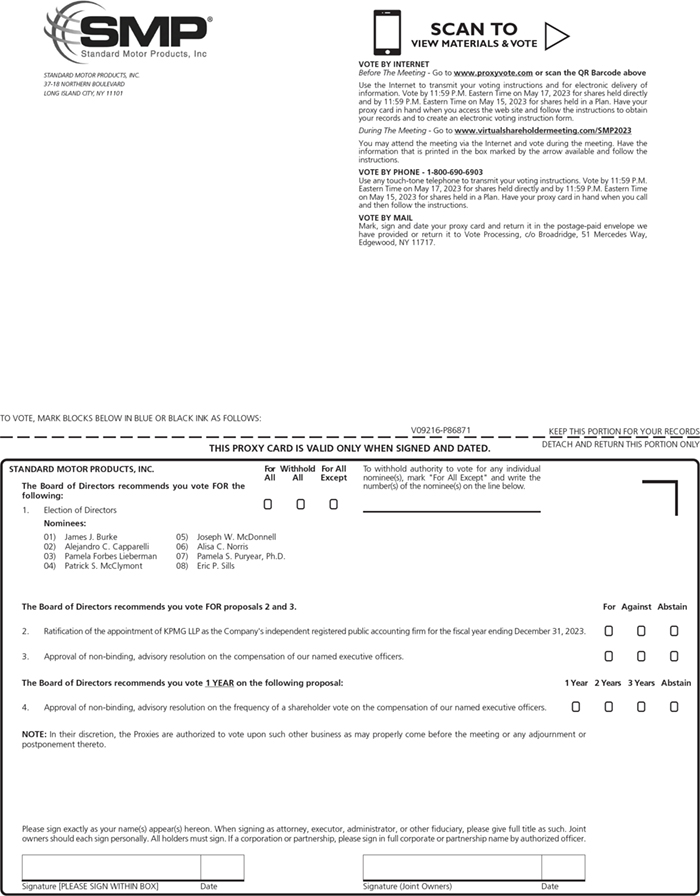 NOTICE IS HEREBY GIVEN that the Annual Meeting of Shareholders of STANDARD MOTOR PRODUCTS, INC. (the “Company”) will be held online at www.virtualshareholdermeeting.com/SMP2023 on Thursday, May 18, 2023 at 2:00 p.m. (Eastern Daylight Time). The Annual Meeting will be held for the following purposes: