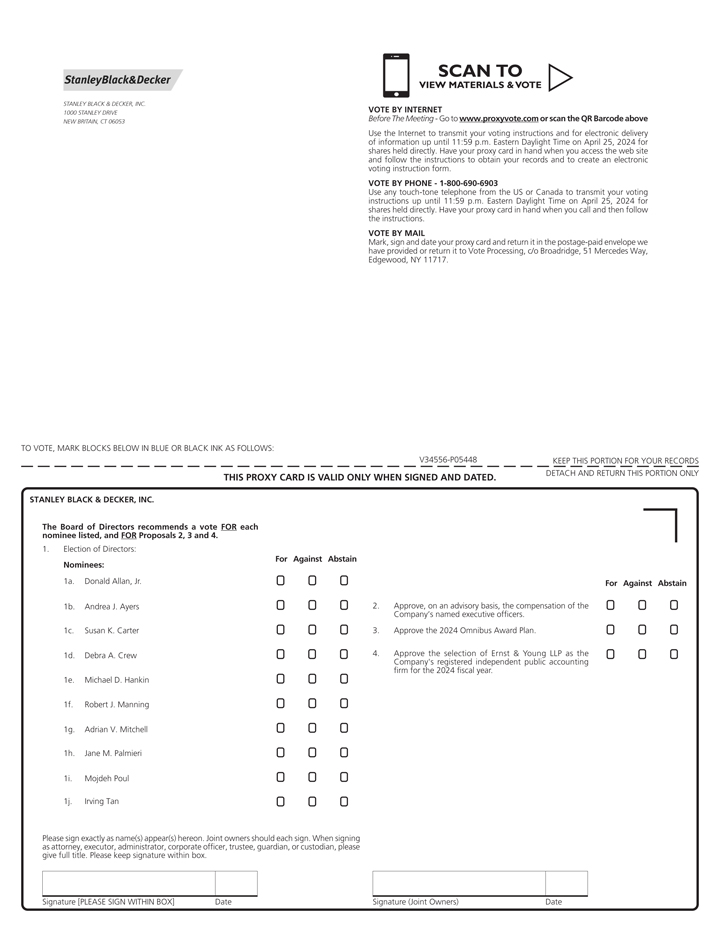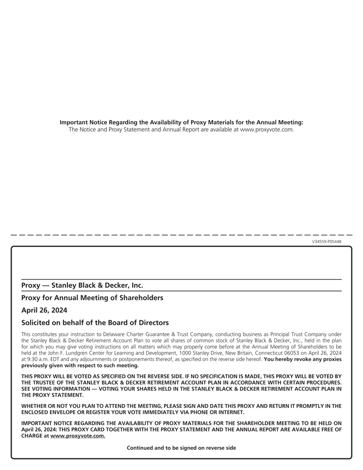 You are cordially invited to attend the Annual Meeting of Shareholders of Stanley Black & Decker, Inc. (“Stanley Black & Decker” or the “Company”) to be held at 9:30 a.m. EDT on April 26, 2024, at the John F. Lundgren Center for Learning and Development, 1000 Stanley Drive, New Britain, Connecticut 06053 (see directions at the end of this document).