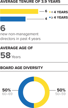 Our Board reflects the diverse set of experiences, perspectives and skills necessary to position the Company for the future. Nine of ten director nominees are independent, and the average tenure of our director nominees is 3.9 years. Our director nominees include five women, two armed forces veterans, and two racially or ethnically diverse men. Two of our director nominees have lived and worked around the world, providing the Company with insights and opinions that are highly relevant to our global business.