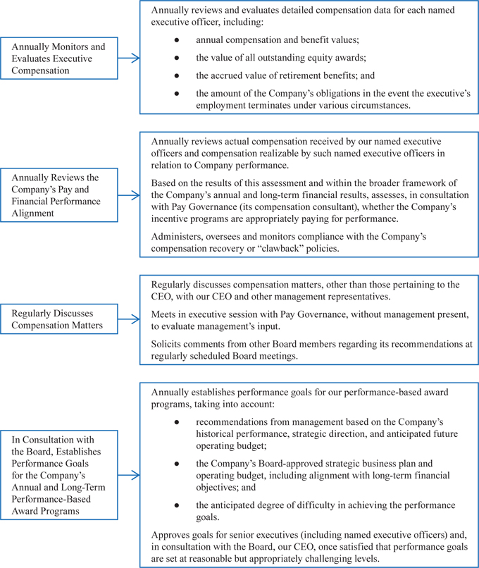 The Corporate Governance Committee annually reviews and confirms that the Board and each of its committees maintains the experience and skills needed to adequately oversee the Company through this time of transition, including through review of the results of our annual Board and Committee evaluation process. Our Audit Committee works closely with our external auditors, financial management and legal counsel to oversee the Company’s financial, cybersecurity, product safety, compliance and other risks. The Compensation and Talent Development Committee reviews executive compensation so that the Company can incentivize ethical, accountable leadership that balances short-term results with long-term, sustainable growth and, together with the full Board, regularly engages with senior management regarding a range of human capital management issues. The Finance and Pension Committee works closely with management to be proactive regarding the Company’s capital structure to manage short-term liquidity as well as long-term financial resilience.