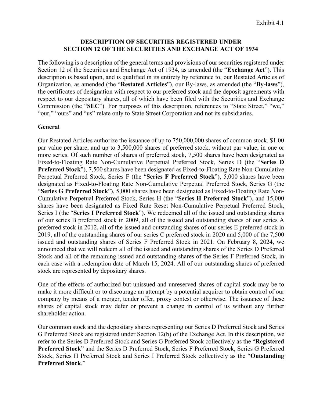 Exhibit 4.1 DESCRIPTION OF SECURITIES REGISTERED UNDER SECTION 12 OF THE SECURITIES AND EXCHANGE ACT OF 1934 The following is a description of the general terms and provisions of our securities registered under Section 12 of the Securities and Exchange Act of 1934, as amended (the “Exchange Act”). This description is based upon, and is qualified in its entirety by reference to, our Restated Articles of Organization, as amended (the “Restated Articles”), our By-laws, as amended (the “By-laws”), the certificates of designation with respect to our preferred stock and the deposit agreements with respect to our depositary shares, all of which have been filed with the Securities and Exchange Commission (the “SEC”). For purposes of this description, references to “State Street,” “we,” “our,” “ours” and “us” relate only to State Street Corporation and not its subsidiaries. General Our Restated Articles authorize the issuance of up to 750,000,000 shares of common stock, $1.00 par value per share, and up to 3,500,000 shares of preferred stock, without par value, in one or more series. Of such number of shares of preferred stock, 7,500 shares have been designated as Fixed-to-Floating Rate Non-Cumulative Perpetual Preferred Stock, Series D (the “Series D Preferred Stock”), 7,500 shares have been designated as Fixed-to-Floating Rate Non-Cumulative Perpetual Preferred Stock, Series F (the “Series F Preferred Stock”), 5,000 shares have been designated as Fixed-to-Floating Rate Non-Cumulative Perpetual Preferred Stock, Series G (the “Series G Preferred Stock”), 5,000 shares have been designated as Fixed-to-Floating Rate Non- Cumulative Perpetual Preferred Stock, Series H (the “Series H Preferred Stock”), and 15,000 shares have been designated as Fixed Rate Reset Non-Cumulative Perpetual Preferred Stock, Series I (the “Series I Preferred Stock”). We redeemed all of the issued and outstanding shares of our series B preferred stock in 2009, all of the issued and outstanding shares of our series A preferred stock in 2012, all of the issued and outstanding shares of our series E preferred stock in 2019, all of the outstanding shares of our series C preferred stock in 2020 and 5,000 of the 7,500 issued and outstanding shares of Series F Preferred Stock in 2021. On February 8, 2024, we announced that we will redeem all of the issued and outstanding shares of the Series D Preferred Stock and all of the remaining issued and outstanding shares of the Series F Preferred Stock, in each case with a redemption date of March 15, 2024. All of our outstanding shares of preferred stock are represented by depositary shares. One of the effects of authorized but unissued and unreserved shares of capital stock may be to make it more difficult or to discourage an attempt by a potential acquirer to obtain control of our company by means of a merger, tender offer, proxy contest or otherwise. The issuance of these shares of capital stock may defer or prevent a change in control of us without any further shareholder action. Our common stock and the depositary shares representing our Series D Preferred Stock and Series G Preferred Stock are registered under Section 12(b) of the Exchange Act. In this description, we refer to the Series D Preferred Stock and Series G Preferred Stock collectively as the “Registered Preferred Stock” and the Series D Preferred Stock, Series F Preferred Stock, Series G Preferred Stock, Series H Preferred Stock and Series I Preferred Stock collectively as the “Outstanding Preferred Stock.”
