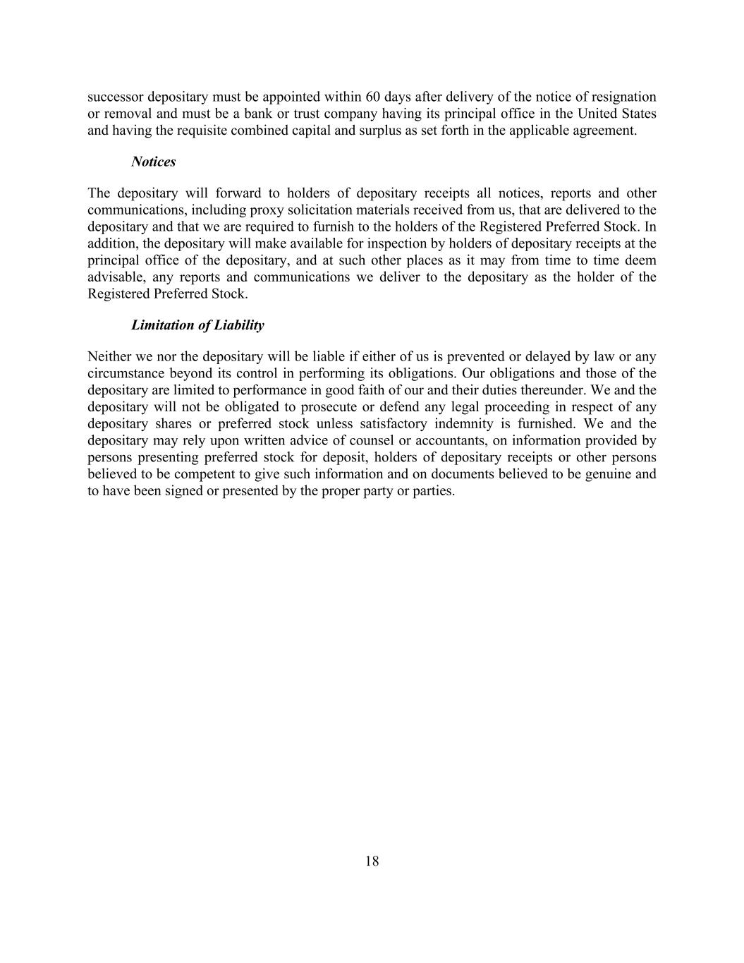 18 successor depositary must be appointed within 60 days after delivery of the notice of resignation or removal and must be a bank or trust company having its principal office in the United States and having the requisite combined capital and surplus as set forth in the applicable agreement. Notices The depositary will forward to holders of depositary receipts all notices, reports and other communications, including proxy solicitation materials received from us, that are delivered to the depositary and that we are required to furnish to the holders of the Registered Preferred Stock. In addition, the depositary will make available for inspection by holders of depositary receipts at the principal office of the depositary, and at such other places as it may from time to time deem advisable, any reports and communications we deliver to the depositary as the holder of the Registered Preferred Stock. Limitation of Liability Neither we nor the depositary will be liable if either of us is prevented or delayed by law or any circumstance beyond its control in performing its obligations. Our obligations and those of the depositary are limited to performance in good faith of our and their duties thereunder. We and the depositary will not be obligated to prosecute or defend any legal proceeding in respect of any depositary shares or preferred stock unless satisfactory indemnity is furnished. We and the depositary may rely upon written advice of counsel or accountants, on information provided by persons presenting preferred stock for deposit, holders of depositary receipts or other persons believed to be competent to give such information and on documents believed to be genuine and to have been signed or presented by the proper party or parties.