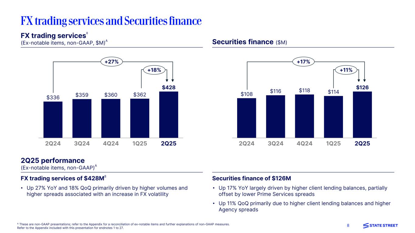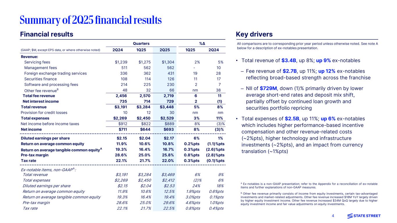 2A Ex-notables is a non-GAAP presentation; refer to the Appendix for a reconciliation of ex-notable items and further explanations of non-GAAP measures.  Refer to the Appendix included with this presentation for endnotes 1 to 27. All comparisons are to corresponding prior year period unless otherwise noted. See note A below for a description of ex-notables presentation. Financial performance • Total revenue of $3.4B, up 8%; up 9% ex-notables; Fee revenue of $2.7B, up 11%; up 12% ex-notables • Total expenses of $2.5B, up 11%; up 6% ex-notables • Operating leverage of (341)bps; 241bps ex-notables; Fee operating leverage of (75)bps; 526bps ex-notables • Pre-tax margin of 26%; 30% ex-notables; ROE of 11%; 13% ex-notables; ROTCE of 17%; 19% ex-notables • EPS of $2.17, up 1%; $2.53, up 18% ex-notables Business momentum Investment Servicing • Record AUC/A of $49.0T at quarter-end; AUC/A wins of $1,093B and AUC/A yet to be installed of $4.0T1 • New servicing fee revenue wins of $145M primarily related to back office2 • Reported 2 new State Street Alpha® mandates; 3 Alpha clients went live in 2Q25, resulting in a total of 28 live clients to-date1 Investment Management • Record AUM of $5.1T at quarter-end with total net inflows of $82B, including record Institutional net inflows of $68B1 • Continued ETF momentum and market share gains in U.S. Low Cost ETF suite, as well as net inflows across Gold, SPY, EMEA, and U.S.  Fixed Income1 • Continued product innovation with 39 new products launched in 2Q25 and 56 new products launched YTD Markets • Record quarterly FX trading volumes, up 17% Balance sheet and capital • Returned $517M to common shareholders, including $300M of share repurchases and $217M of declared dividends • Announced a planned 11% increase to 3Q25 per share quarterly common stock dividend to $0.84, subject to Board approval3 • CET1 ratio of 10.7% and State Street Bank and Trust LCR of 136% at quarter-end4,5 • Strong performance under Federal Reserve supervisory stress test, preliminary SCB maintained at 2.5% floor6