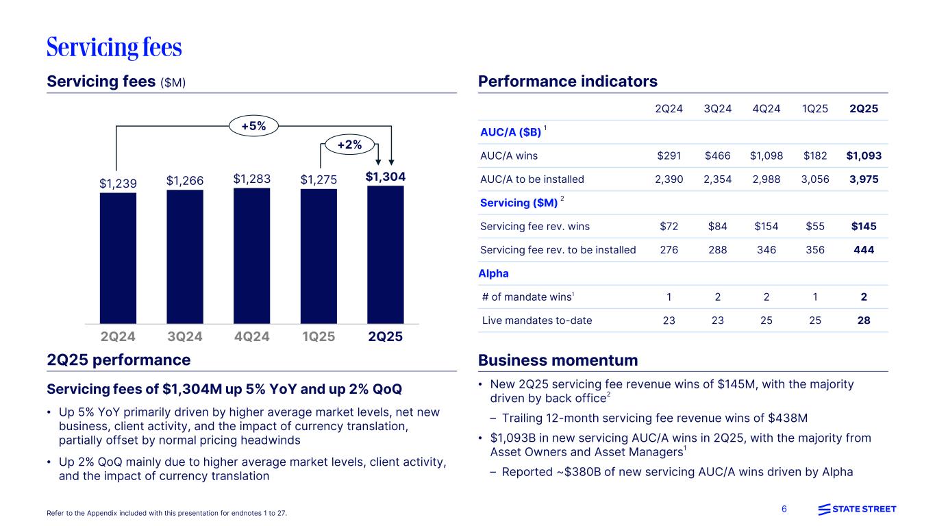 6 Servicing fees of $1,304M up 5% YoY and up 2% QoQ • Up 5% YoY primarily driven by higher average market levels, net new  business, client activity, and the impact of currency translation,  partially offset by normal pricing headwinds • Up 2% QoQ mainly due to higher average market levels, client activity,  and the impact of currency translation Servicing fees ($M) 2Q25 performance 2Q24 3Q24 4Q24 1Q25 2Q25 $1,239 $1,266 $1,283 $1,275 $1,304 Business momentum • New 2Q25 servicing fee revenue wins of $145M, with the majority  driven by back office2 – Trailing 12-month servicing fee revenue wins of $438M • $1,093B in new servicing AUC/A wins in 2Q25, with the majority from  Asset Owners and Asset Managers1 – Reported ~$380B of new servicing AUC/A wins driven by Alpha +5% +2% Refer to the Appendix included with this presentation for endnotes 1 to 27. 2Q24 3Q24 4Q24 1Q25 2Q25 AUC/A ($B) 1 AUC/A wins $291 $466 $1,098 $182 $1,093 AUC/A to be installed 2,390 2,354 2,988 3,056 3,975 Servicing ($M) 2 Servicing fee rev. wins $72 $84 $154 $55 $145 Servicing fee rev. to be installed 276 288 346 356 444 Alpha # of mandate wins1 1 2 2 1 2 Live mandates to-date 23 23 25 25 28 Performance indicators