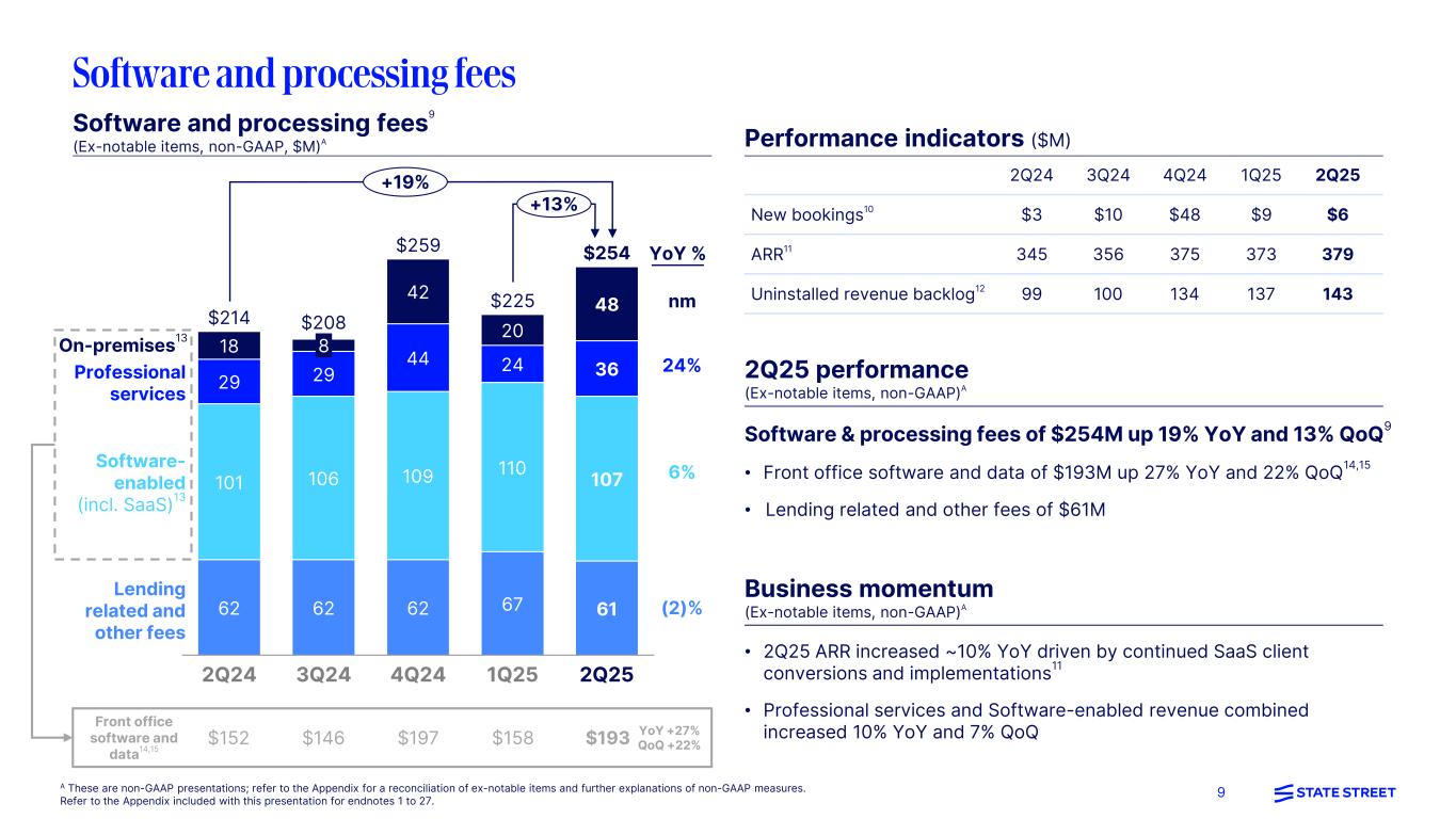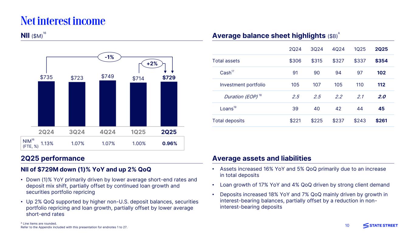 20 10. Front office bookings represent signed ARR contract values for CRD, CRD for Private Markets, Alpha Data Platform, and Alpha Data Services excluding bookings with affiliates, including State Street Investment  Management. Front office revenue derived from affiliate agreements is eliminated in consolidation for financial reporting purposes. 11. Front office software and data annual recurring revenue (ARR), an operating metric, is calculated by annualizing current quarter revenue for CRD and CRD for Private Markets and includes the annualized amount of most  software-enabled revenue, including revenue generated from SaaS, maintenance and support revenue, FIX, and value-added services, which are all expected to be recognized ratably over the term of client contracts.  Front office software and data ARR does not include software-enabled brokerage revenue, revenue from affiliates and licensing fees (excluding the portion allocated to maintenance and support) from On-premises  software. 12. Represents expected ARR from signed client contracts that are scheduled to be largely installed over the next 24 months for CRD, CRD for Private Markets and Alpha Data Services. It includes SaaS revenue, as well as  maintenance and support revenue, and excludes the one-time impact of On-premises license revenue, revenue generated from FIX, brokerage, value-add services, and professional services as well as revenue from  affiliates. 13. On-premises revenue is revenue derived from locally installed software. Software-enabled revenue includes SaaS, maintenance and support revenue, FIX, brokerage, and value-add services. The revenue recognition  pattern for On-premises installations differs from software-enabled revenue. 14. Front office software and data revenue primarily includes revenue from CRD, Alpha Data Platform and Alpha Data Services. Includes Other revenue of $3-4M in each of 2Q24 through 2Q25. Revenue line items may not  sum to total due to rounding. 15. GAAP Front office software and data of $169M in 2Q25 included a notable item related to an Alpha-related client rescoping of $24M. Excluding the notable item, 2Q25 adjusted Front office software and data of $193M  was up 27% compared to GAAP 2Q24 Front office software and data of $152M and up 22% compared to GAAP 1Q25 Front office software and data of $158M. 16. NII is presented on a GAAP-basis. NIM is presented on a fully taxable-equivalent (FTE) basis, and is calculated by dividing FTE NII by average total interest-earning assets. Refer to the Addendum for reconciliations of NII  FTE-basis to NII GAAP-basis on the Average Statement of Condition. 17. Includes Cash and due from banks and Interest-bearing deposits with banks. 18. Duration as of period end and based on the total investment portfolio. 19. Average loans are presented on a gross basis. Refer to the Addendum for average loans net of expected credit losses.  20. GAAP Compensation and employee benefits expenses of $1,280M in 2Q25 included a notable item related to a repositioning charge of $100M. Excluding this notable item, 2Q25 adjusted Compensation and employee  benefits of $1,180M was up 7% compared to 2Q24 GAAP Compensation and employee benefits of $1,099M and down (6)% compared to 1Q25 GAAP Compensation and employee benefits of $1,262M. GAAP Information  systems and communications expenses of $523M in 2Q25 included a notable item related to an Alpha-related client rescoping of $18M. Excluding this notable item, 2Q25 adjusted Information systems and  communications expenses of $505M was up 11% compared to 2Q24 GAAP Information systems and communications expenses of $454M and up 2% compared to 1Q25 GAAP Information systems and communications  expenses of $497M. GAAP Other expenses of $361M in 2Q25 included a notable item related to a $1M release of a prior period notable item. Excluding this notable item, 2Q25 adjusted Other expenses of $362M was up  1% compared to 2Q24 GAAP Other expenses of $360M and up 10% compared to 1Q25 GAAP Other expenses of $330M. 21. Other, excluding notable items, includes Other expenses and Amortization of intangible assets. 22. The SCB of 2.5% effective on October 1, 2025 is calculated based upon the results of the 2025 Federal Reserve supervisory stress test. 23. Adjusted average assets (Tier 1) is equal to average consolidated assets less applicable Tier 1 leverage capital reductions under regulatory standards. 24. The Tier 1 leverage ratio differs from the SLR primarily in that the denominator of the Tier 1 leverage ratio is a quarterly average of on-balance sheet assets, while the SLR additionally includes off-balance sheet  exposures. In addition, STT’s SLR includes regulatory deductions. Refer to the Addendum for additional information on regulatory capital.  25. Capital returned represents the common stock dividends declared during 2Q25 and common share repurchases made in 2Q25. Total payout represents capital returned divided by net income available to common  shareholders over the period of 2Q25. The total payout ratio was 82% in 2Q25. 26. As a U.S. G-SIB, State Street must maintain a 2% SLR buffer at the holding company and a 3% buffer at State Street Bank in order to avoid any limitations on distributions to shareholders and discretionary bonus  payments to certain executives.   27. Represents aggregated quarterly declared preferred stock dividends (estimated for future periods). Future dividends are estimated based on the preferred stock outstanding as of June 30, 2025, along with any public  announcements of issuances and redemptions through the date hereof. These estimates do not account for any potential future issuances or redemptions, which could alter the projected preferred stock dividends. State  Street’s preferred stock dividends, including the declaration, timing and amount, remain subject to consideration and approval by State Street’s Board of Directors at the relevant times. Full year dividends may not sum to  total due to
