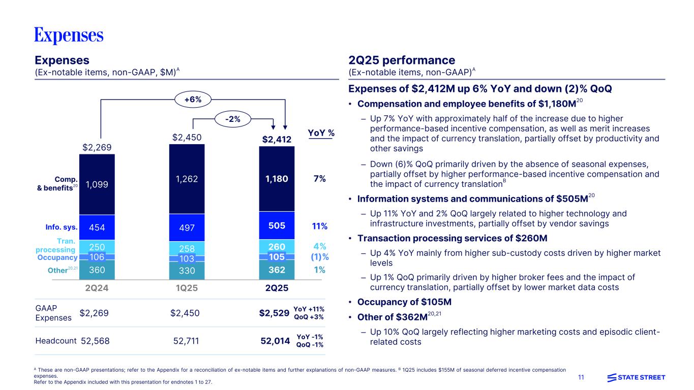 11 Expenses of $2,412M up 6% YoY and down (2)% QoQ • Compensation and employee benefits of $1,180M20 – Up 7% YoY with approximately half of the increase due to higher  performance-based incentive compensation, as well as merit increases  and the impact of currency translation, partially offset by productivity and  other savings – Down (6)% QoQ primarily driven by the absence of seasonal expenses,  partially offset by higher performance-based incentive compensation and  the impact of currency translationB • Information systems and communications of $505M20 – Up 11% YoY and 2% QoQ largely related to higher technology and  infrastructure investments, partially offset by vendor savings • Transaction processing services of $260M – Up 4% YoY mainly from higher sub-custody costs driven by higher market  levels – Up 1% QoQ primarily driven by higher broker fees and the impact of  currency translation, partially offset by lower market data costs • Occupancy of $105M • Other of $362M20,21 – Up 10% QoQ largely reflecting higher marketing costs and episodic client- related costs 360 330 362 250 258 260 454 497 505 1,099 1,262 1,180 106 2Q24 103 1Q25 105 2Q25 $2,269 $2,450 $2,412 A These are non-GAAP presentations; refer to the Appendix for a reconciliation of ex-notable items and further explanations of non-GAAP measures. B 1Q25 includes $155M of seasonal deferred incentive compensation  expenses.  Refer to the Appendix included with this presentation for endnotes 1 to 27. Comp. & benefits20 Info. sys. Tran. processing Other20,21 Occupancy +6% Expenses (Ex-notable items, non-GAAP, $M)A 2Q25 performance (Ex-notable items, non-GAAP)A -2% 7% 11% 4% YoY % (1)% 1% $2,269 $2,450 $2,529 52,568 52,711 52,014 GAAP  Expenses Headcount YoY +11% QoQ +3% YoY -1% QoQ -1%