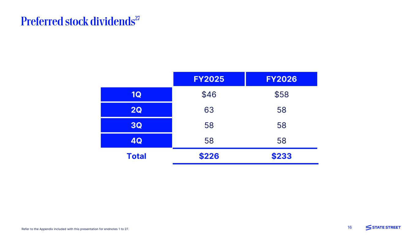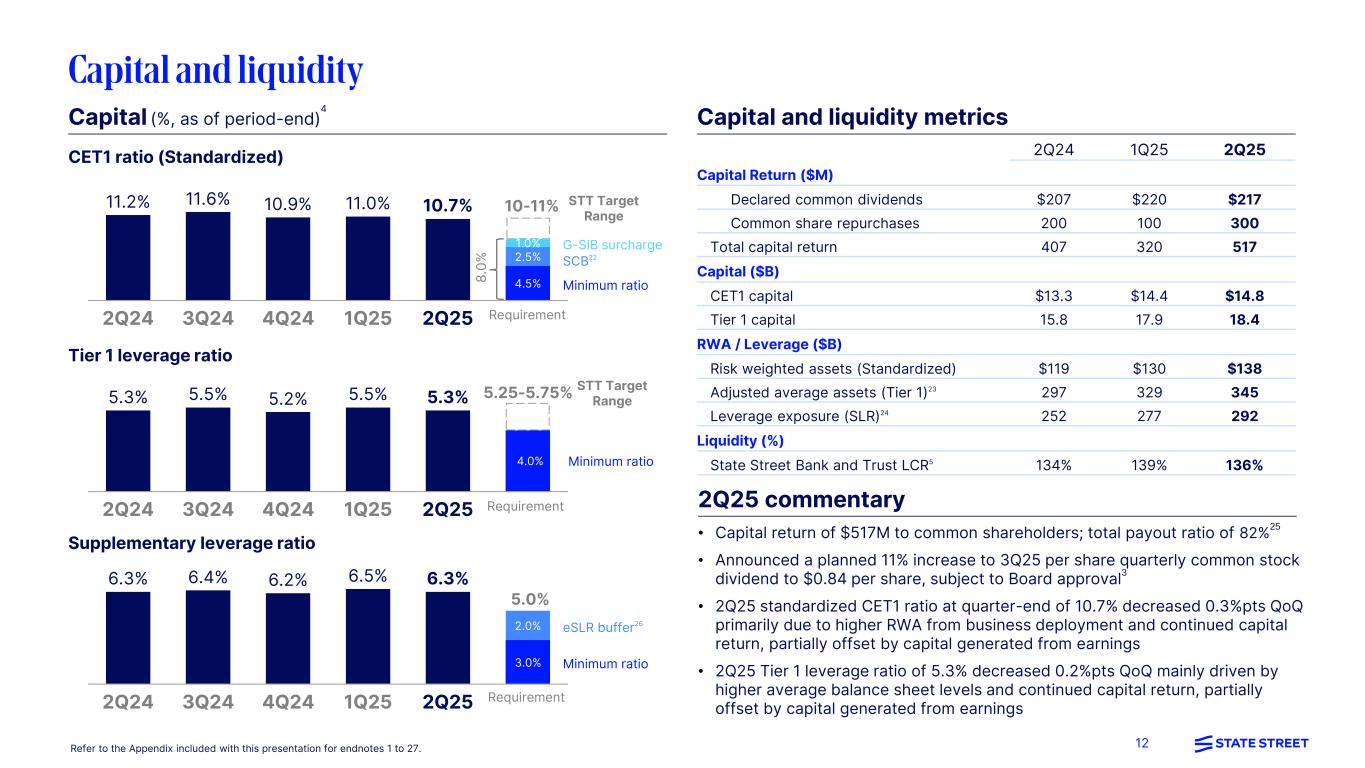 12 eSLR buffer26 • Capital return of $517M to common shareholders; total payout ratio of 82%25 • Announced a planned 11% increase to 3Q25 per share quarterly common stock  dividend to $0.84 per share, subject to Board approval3 • 2Q25 standardized CET1 ratio at quarter-end of 10.7% decreased 0.3%pts QoQ  primarily due to higher RWA from business deployment and continued capital  return, partially offset by capital generated from earnings • 2Q25 Tier 1 leverage ratio of 5.3% decreased 0.2%pts QoQ mainly driven by  higher average balance sheet levels and continued capital return, partially  offset by capital generated from earnings 2Q24 1Q25 2Q25 Capital Return ($M) Declared common dividends $207 $220 $217 Common share repurchases 200 100 300 Total capital return 407 320 517 Capital ($B) CET1 capital $13.3 $14.4 $14.8 Tier 1 capital 15.8 17.9 18.4 RWA / Leverage ($B) Risk weighted assets (Standardized) $119 $130 $138 Adjusted average assets (Tier 1)23 297 329 345 Leverage exposure (SLR)24 252 277 292 Liquidity (%) State Street Bank and Trust LCR5 134% 139% 136% 2Q25 commentary Capital and liquidity metrics Tier 1 leverage ratio 5.3% 5.5% 5.2% 5.5% 5.3% 2Q24 3Q24 4Q24 1Q25 2Q25 Minimum ratio4.0% STT Target Range5.25-5.75% Refer to the Appendix included with this presentation for endnotes 1 to 27. CET1 ratio (Standardized) 11.2% 11.6% 10.9% 11.0% 10.7% 4.5% 2.5% 2Q24 3Q24 4Q24 1Q25 2Q25 SCB22 Minimum ratio8 .0 % 10-11% G-SIB surcharge1.0% Capital   (%, as of period-end) 4 Supplementary leverage ratio Requirement Requirement Requirement 6.3% 6.4% 6.2% 6.5% 6.3% 3.0% 2.0% 2Q24 3Q24 4Q24 1Q25 2Q25 STT Target Range Minimum ratio 5.0%