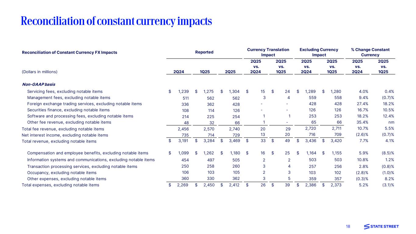17 A Calculated as the period-over-period change in total fee revenue less the period-over-period change in total expenses. B Calculated as the period-over-period change in total fee revenue, excluding notable items less the  period-over-period change in total expenses, excluding notable items. C Calculated as the period-over-period change in total revenue less the period-over-period change in total expenses. D Calculated as the period-over- period change in total revenue, excluding notable items less the period-over-period change in total expenses, excluding notable items. Quarterly reconciliation % Change (Dollars in millions, unless noted otherwise) 1Q24 2Q24 3Q24 4Q24 1Q25 2Q25 2Q25  vs.  2Q24 2Q25  vs.  1Q25 2024 2025 YTD 2025  vs.  YTD 2024 Total fee revenue, GAAP-basis 2,422$              2,456$              2,616$               2,662$              2,570$              2,719$               10.7% 5.8% 4,878$       5,289$      8.4% Less: Notable items: Foreign exchange trading services (15)                    (3)                      (3)               Client rescoping (revenue) 24                     24              Other fee revenue (66)                     Total fee revenue, excluding notable items 2,422                    2,456                    2,535                    2,662                    2,570                    2,740                    11.6% 6.6% 4,878         5,310          8.9% Total revenue, GAAP-basis 3,138                 3,191                 3,259                3,412                 3,284                3,448                8.1% 5.0% 6,329        6,732         6.4% Less: Notable items: Foreign exchange trading services (15)                    (3)                      (3)               Client rescoping (revenue) 24                     24              Other fee revenue (66)                     (Gains) losses related to investment securities, net 81                       Total revenue, excluding notable items 3,138                    3,191                     3,259                    3,412                     3,284                    3,469                   8.7% 5.6% 6,329         6,753          6.7% Total expenses, GAAP basis 2,513                 2,269                2,308                2,440                2,450                2,529                11.5% 3.2% 4,782         4,979         4.1% Less: Notable items: Deferred compensation expense acceleration (79)                    -             Repositioning charges 2                       (100)                  (100)            Client rescoping (expense) (18)                    (18)              FDIC special assessment (130)                  31                      (130)            Other notable items (12)                    1                        1                 Total expenses, excluding notable items 2,383                    2,269                    2,308                    2,382                    2,450                    2,412                     6.3% (1.6)% 4,652          4,862         4.5% Seasonal expenses (162)                  (155)                  (162)           (155)            Total expenses, excluding notable items and seasonal expense items 2,221$                  2,269$                 2,308$                 2,382$                 2,295$                 2,412$                  6.3% 5.1% 4,490$      4,707$       4.8% Fee operating leverage, GAAP-basis (%pts)A (75) bps 258 bps 431 bps Fee operating leverage, excluding notable items (%pts)B 526 bps 816 bps 435 bps Operating leverage, GAAP-basis (%pts)C (341) bps 177 bps 225 bps Operating leverage, excluding notable items (%pts)D 241 bps 718 bps 219 bps Pre-tax margin, GAAP-basis (%) 19.1% 28.6% 28.4% 28.1% 25.0% 25.8% (2.8)% pts 0.8% pts 23.9% 25.4% 1.5% pts Notable items as reconciled above (%) 4.1% 1.7% 3.8% 2.0% 2.0% Pre-tax margin, excluding notable items (%) 23.2% 28.6% 28.4% 29.8% 25.0% 29.6% 1.0% pts 4.6% pts 25.9% 27.4% 1.5% pts Net income available to common shareholders, GAAP-basis 418$                  655$                 682$                 728$                 597$                 630$                 (3.8)% 5.5% 1,073$       1,227$       14.4% Notable items as reconciled above: pre-tax 130                    58                     138                    130            138             Tax impact on notable items as reconciled above (31)                    (17)                     (35)                    (31)             (35)             Net income available to common shareholders, excluding notable items 517$                      655$                     682$                     769$                     597$                     733$                     11.9% 22.8% 1,172$         1,330$       13.5% Diluted EPS, GAAP-basis 1.37$                 2.15$                 2.26$                2.46$                2.04$                2.17$                 0.9% 6.4% 3.52$        4.21$         19.6% Notable items as reconciled above 0.32                  0.14                   0.36                  0.32          0.36           Diluted EPS, excluding notable items 1.69$                    2.15$                     2.26$                    2.60$                    2.04$                    2.53$                    17.7% 24.0% 3.84$         4.57$          19.0% % Change Year-to-Date