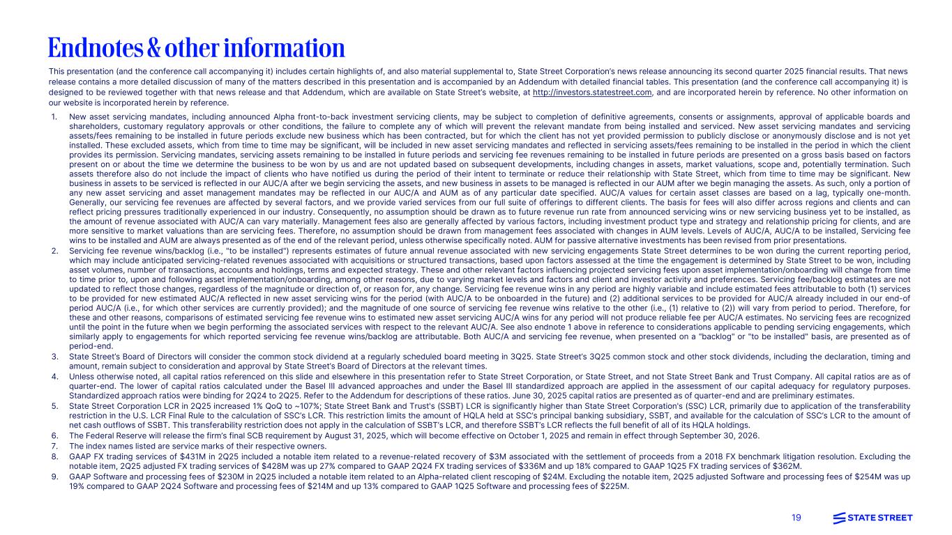 19 This presentation (and the conference call accompanying it) includes certain highlights of, and also material supplemental to, State Street Corporation’s news release announcing its second quarter 2025 financial results. That news  release contains a more detailed discussion of many of the matters described in this presentation and is accompanied by an Addendum with detailed financial tables. This presentation (and the conference call accompanying it) is  designed to be reviewed together with that news release and that Addendum, which are available on State Street’s website, at http://investors.statestreet.com, and are incorporated herein by reference. No other information on  our website is incorporated herein by reference. 1. New asset servicing mandates, including announced Alpha front-to-back investment servicing clients, may be subject to completion of definitive agreements, consents or assignments, approval of applicable boards and  shareholders, customary regulatory approvals or other conditions, the failure to complete any of which will prevent the relevant mandate from being installed and serviced. New asset servicing mandates and servicing  assets/fees remaining to be installed in future periods exclude new business which has been contracted, but for which the client has not yet provided permission to publicly disclose or anonymously disclose and is not yet  installed. These excluded assets, which from time to time may be significant, will be included in new asset servicing mandates and reflected in servicing assets/fees remaining to be installed in the period in which the client  provides its permission. Servicing mandates, servicing assets remaining to be installed in future periods and servicing fee revenues remaining to be installed in future periods are presented on a gross basis based on factors  present on or about the time we determine the business to be won by us and are not updated based on subsequent developments, including changes in assets, market valuations, scope and, potentially termination. Such  assets therefore also do not include the impact of clients who have notified us during the period of their intent to terminate or reduce their relationship with State Street, which from time to time may be significant. New  business in assets to be serviced is reflected in our AUC/A after we begin servicing the assets, and new business in assets to be managed is reflected in our AUM after we begin managing the assets. As such, only a portion of  any new asset servicing and asset management mandates may be reflected in our AUC/A and AUM as of any particular date specified. AUC/A values for certain asset classes are based on a lag, typically one-month.  Generally, our servicing fee revenues are affected by several factors, and we provide varied services from our full suite of offerings to different clients. The basis for fees will also differ across regions and clients and can  reflect pricing pressures traditionally experienced in our industry. Consequently, no assumption should be drawn as to future revenue run rate from announced servicing wins or new servicing business yet to be installed, as  the amount of revenue associated with AUC/A can vary materially. Management fees also are generally affected by various factors, including investment product type and strategy and relationship pricing for clients, and are  more sensitive to market valuations than are servicing fees. Therefore, no assumption should be drawn from management fees associated with changes in AUM levels. Levels of AUC/A, AUC/A to be installed, Servicing fee  wins to be installed and AUM are always presented as of the end of the relevant period, unless otherwise specifically noted. AUM for passive alternative investments has been revised from prior presentations. 2. Servicing fee revenue wins/backlog (i.e., "to be installed") represents estimates of future annual revenue associated with new servicing engagements State Street determines to be won during the current reporting period,  which may include anticipated servicing-related revenues associated with acquisitions or structured transactions, based upon factors assessed at the time the engagement is determined by State Street to be won, including  asset volumes, number of transactions, accounts and holdings, terms and expected strategy. These and other relevant factors influencing projected servicing fees upon asset implementation/onboarding will change from time  to time prior to, upon and following asset implementation/onboarding, among other reasons, due to varying market levels and factors and client and investor activity and preferences. Servicing fee/backlog estimates are not  updated to reflect those changes, regardless of the magnitude or direction of, or reason for, any change. Servicing fee revenue wins in any period are highly variable and include estimated fees attributable to both (1) services  to be provided for new estimated AUC/A reflected in new asset servicing wins for the period (with AUC/A to be onboarded in the future) and (2) additional services to be provided for AUC/A already included in our end-of  period AUC/A (i.e., for which other services are currently provided); and the magnitude of one source of servicing fee revenue wins relative to the other (i.e., (1) relative to (2)) will vary from period to period. Therefore, for  these and other reasons, comparisons of estimated servicing fee revenue wins to estimated new asset servicing AUC/A wins for any period will not produce reliable fee per AUC/A estimates. No servicing fees are recognized  until the point in the future when we begin performing the associated services with respect to the relevant AUC/A. See also endnote 1 above in reference to considerations applicable to pending servicing engagements, which  similarly apply to engagements for which reported servicing fee revenue wins/backlog are attributable. Both AUC/A and servicing fee revenue, when presented on a