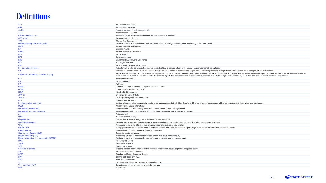 23 ACWI All Country World Index ARR Annual recurring revenue AUC/A Assets under custody and/or administration AUM Assets under management Bloomberg Global Agg Bloomberg Global Agg represents Bloomberg Global Aggregate Bond Index CET1 ratio Common equity tier 1 ratio CRD Charles River Development Diluted earnings per share (EPS) Net income available to common shareholders divided by diluted average common shares outstanding for the noted period EAFE Europe, Australia, and Far East EM Emerging markets EMEA Europe, Middle East and Africa EOP End of period EPS Earnings per share ESG Environmental, Social, and Governance ETF Exchange-traded fund FDIC Federal Deposit Insurance Corporation Fee operating leverage Rate of growth of total fee revenue less the rate of growth of total expenses, relative to the successive prior year period, as applicable FIX The Charles River Network's FIX Network Service (CRN) is an end-to-end trade execution and support service facilitating electronic trading between Charles River's asset management and broker clients Front office uninstalled revenue backlog Represents the annualized recurring revenue from signed client contracts that are scheduled to be fully installed over the next 24 months for CRD, Charles River for Private Markets and Alpha Data Services. It includes SaaS revenue as well as  maintenance and support revenue and excludes the one-time impact of on-premises license revenue, revenue generated from FIX, brokerage, value-add services, and professional services as well as revenue from affiliates FTE Fully taxable-equivalent FX Foreign exchange FY Full-year GAAP Generally accepted accounting principles in the United States G-SIB Global systemically important bank HQLA High Quality Liquid Assets JPM G7 JP Morgan G7 Volatility Index JPM EM JP Morgan Emerging Market Bond Index LCR Liquidity Coverage Ratio Lending related and other Lending related and other fees primarily consist of fee revenue associated with State Street’s fund finance, leveraged loans, municipal finance, insurance and stable value wrap businesses MSCI Morgan Stanley Capital International Net interest income (NII) Income earned on interest bearing assets less interest paid on interest bearing liabilities Net interest margin (NIM) (FTE) Fully taxable-equivalent (FTE) Net interest income divided by average total interest-earning assets nm Not meaningful NYSE New York Stock Exchange On-premises On-premises revenue as recognized in Front office software and data Operating leverage Rate of growth of total revenue less the rate of growth of total expenses, relative to the corresponding prior year period, as applicable %Pts Percentage points is the difference from one percentage value subtracted from another Payout ratio Total payout ratio is equal to common stock dividends and common stock purchases as a percentage of net income available to common shareholders Pre-tax margin Income before income tax expense divided by total revenue Quarter-over-Quarter (QoQ) Sequential quarter comparison Return on equity (ROE) Net income available to common shareholders divided by average common equity Return on tangible common equity (ROTCE) Net income available to common shareholders divided by average tangible common equity RWA Risk weighted assets SaaS Software as a service SCB Stress capital buffer Seasonal expenses Seasonal deferred incentive compensation expenses for retirement-eligible employees and payroll taxes SEC Securities Exchange Commission SPDR Standard and Poor's Depository Receipt SPY SPDR® S&P 500® ETF Trust SSC State Street Corporation VIX Chicago Board Options Exchange's CBOE Volatility Index Year-over-Year (YoY) Current period compared to the same period a year ago YTD Year-to-date