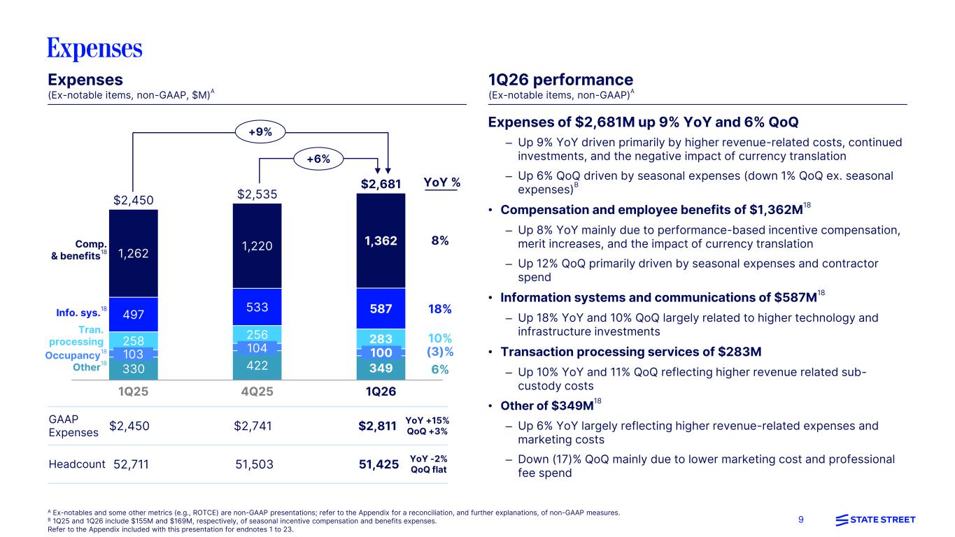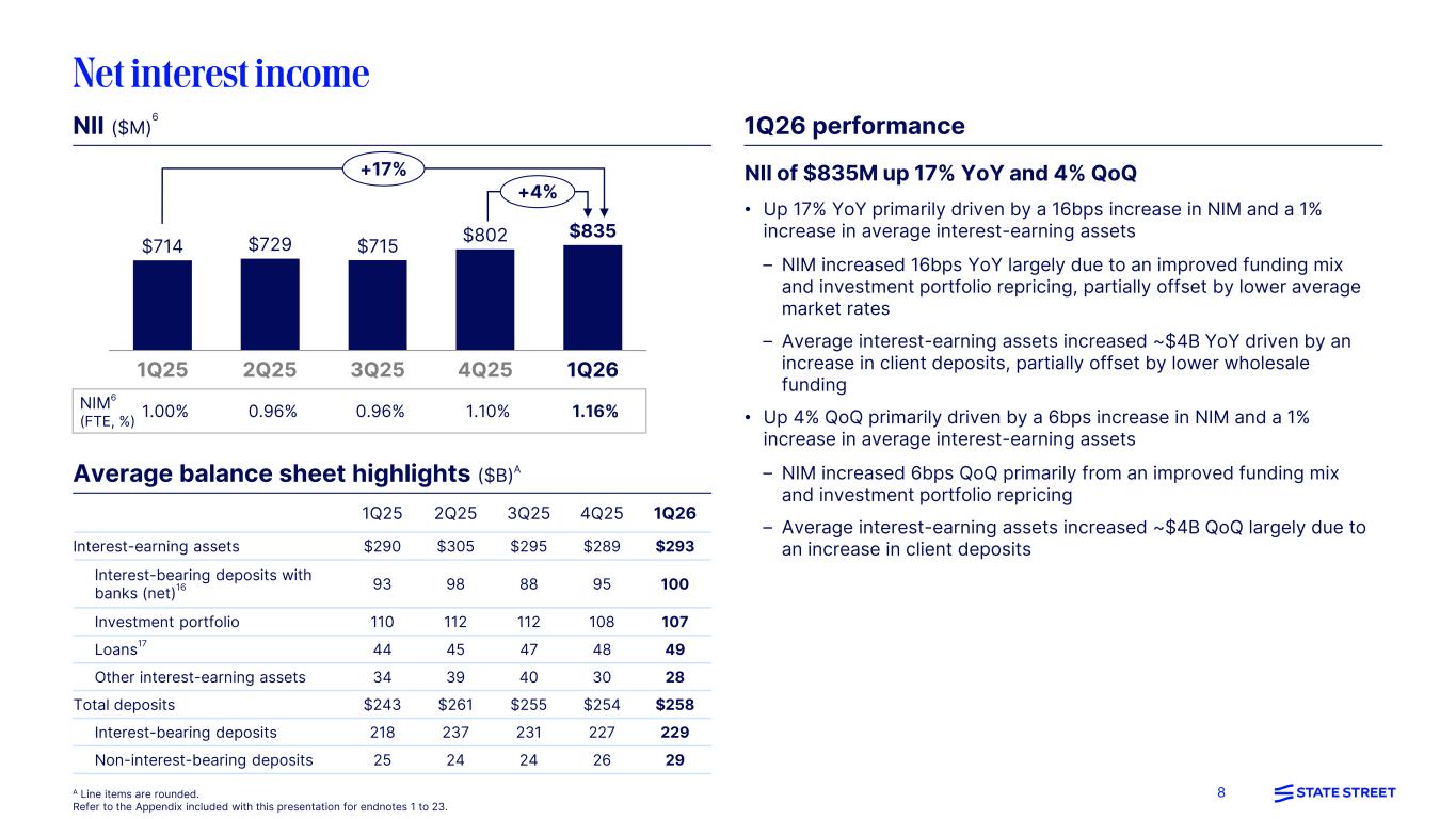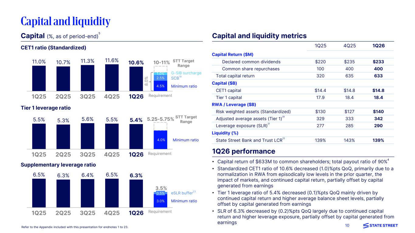 18 Endnotes & other information (cont.) 8. 4Q25 Repositioning charges of $(226)M represents $111M reflected in Compensation and employee benefits primarily from workforce rationalization, $69M reflected in Occupancy costs associated with real estate footprint optimization, and Operating model changes of $24M and $22M reflected in Information Systems and Communications and Other expenses, respectively. 1Q26 Repositioning charges of $(89)M represents $79M reflected in Compensation and employee benefits primarily from workforce rationalization, Operating model changes of $9M reflected in Information systems and communications, and a $1M charge reflected in Occupancy costs associated with real estate footprint optimization. 1Q26 Client rescoping of $(41)M reflected in Information systems and communications. 9. GAAP FX trading services of $393M in 2Q25 included a notable item related to a revenue-related recovery of $3M associated with the proceeds from a 2018 FX benchmark litigation resolution. Excluding this notable item, 2Q25 adjusted FX trading services was $390M. 10. GAAP Software services of $169M in 2Q25 included a notable item related to an Alpha-related client rescoping of $24M. Excluding this notable item, 2Q25 adjusted Software services was $193M. 11. On-premises revenue is revenue derived from locally installed software. Software and data revenue includes SaaS, maintenance and support revenue, FIX, brokerage, and value-add services. The revenue recognition pattern for On-premises installations differs from Software and data revenue. 12. Software services revenue primarily includes revenue from CRD, Alpha Data Platform and Alpha Data Services. Includes Other revenue of $3-4M in each of 1Q25 through 1Q26. Revenue line items may not sum to total due to rounding. 13. Software services annual recurring revenue (ARR), an operating metric, is calculated by annualizing current quarter revenue for CRD and CRD for Private Markets and includes the annualized amount of most Software and data revenue, including revenue generated from SaaS, maintenance and support revenue, FIX, and value-added services, which are all expected to be recognized ratably over the term of client contracts. Software services ARR does not include Software and data brokerage revenue, revenue from affiliates and licensing fees (excluding the portion allocated to maintenance and support) from On-premises software. 14. Software services bookings represent signed ARR contract values for CRD, CRD for Private Markets, Alpha Data Platform, and Alpha Data Services excluding bookings with affiliates, including State Street Investment Management. Software services revenue derived from affiliate agreements is eliminated in consolidation for financial reporting purposes. 15. Represents expected ARR from signed client contracts that are scheduled to be largely installed over the next 24 months for CRD, CRD for Private Markets and Alpha Data Services. It includes SaaS revenue, as well as maintenance and support revenue, and excludes the one-time impact of On-premises license revenue, revenue generated from FIX, brokerage, value-add services, and professional services as well as revenue from affiliates. 16. These deposits primarily reflect our maintenance of cash balances at the Federal Reserve, the ECB and other non-U.S. central banks. 17. Average loans are presented on a gross basis. Refer to the Addendum for average loans net of expected credit losses. 18. GAAP Compensation and employee benefits expenses of $1,441M in 1Q26 included a notable item related to a repositioning charge of $79M. GAAP Compensation and employee benefits expenses of $1,331M in 4Q25 included a notable item related to a repositioning charge of $111M. Excluding these notable items, adjusted 1Q26 Compensation and employee benefits of $1,362M increased 12% compared to adjusted 4Q25 Compensation and employee benefits of $1,220M. GAAP Information systems and communications expenses of $637M in 1Q26 included notable items related to a client rescoping of $41M and operating model changes of $9M. GAAP Information systems and communications expenses of $557M in 4Q25 included a notable item related to operating model changes of $24M. Excluding these notable items, adjusted 1Q26 Information systems and communications expenses of $587M increased 10% compared to adjusted 4Q25 Information systems and communications expenses of $533M. GAAP Occupancy expenses of $101M in 1Q26 included a notable item related to a repositioning charge of $1M. GAAP Occupancy expenses of $173M in 4Q25 included a notable item related to a repositioning charge of $69M. Excluding these notable items, adjusted 1Q26 Occupancy expenses of $100M decreased 4% compared to adjusted 4Q25 Occupancy expenses of $104M. GAAP Other expenses of $424M in 4Q25 included notable items related to an FDIC special assessment release of $60M, legal and related costs of $40M, and a charge related to operating model changes of $22M. Excluding these notable items, adjusted 1Q26 Other expenses of $349M decreased 17% compared to adjusted 4Q25 Other expenses of $422M. 19. The SCB of 2.5% effective on October 1, 2025 is calculated based upon the results of the 2025 Federal Reserve supervisory stress test. 20. Adjusted average assets (Tier 1) is equal to average consolidated assets less applicable Tier 1 leverage capital reductions under regulatory standards. 21. The Tier 1 leverage ratio differs from the SLR primarily in that the denominator of the Tier 1 leverage ratio is a quarterly average of on-balance sheet assets, while the SLR additionally includes off-balance sheet exposures. In addition, STT’s SLR includes regulatory deductions. Refer to the Addendum for additional information on regulatory capital. 22. State Street Corporation LCR in 1Q26 was flat QoQ at ~106%; State Street Bank and Trust's (SSBT) LCR is significantly higher than State Street Corporation's (SSC) LCR, primarily due to application of the transferabil