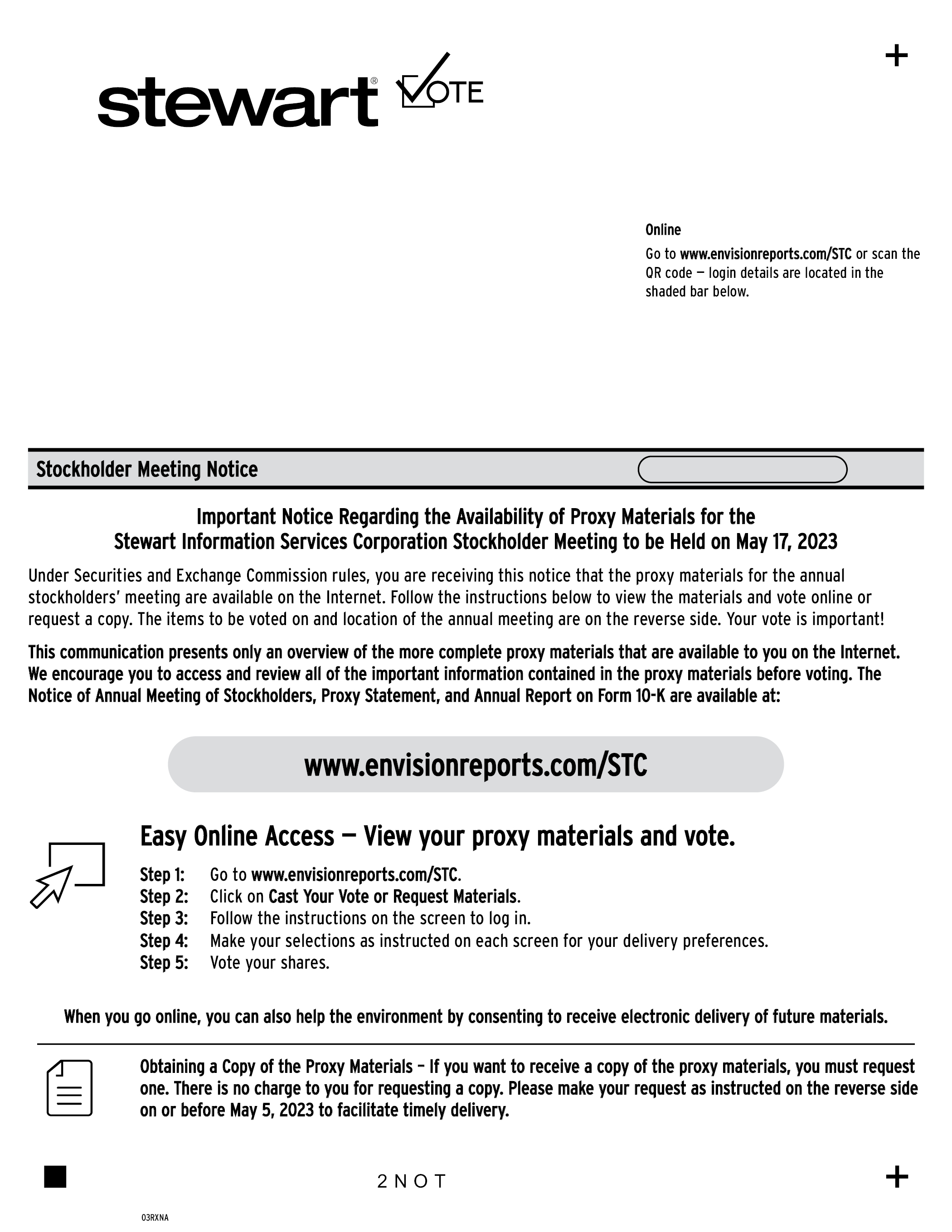 Step 1: Go to www.envisionreports.com/STC. Step 2: Click on Cast Your Vote or Request Materials. Step 3: Follow the instructions on the screen to log in. www.envisionreports.com/STC Online Go to www.envisionreports.com/STC or scan the QR code login details are located in the shaded bar below. Stockholder Meeting Notice Important Notice Regarding the Availability of Proxy Materials for the Stewart Information Services Corporation Stockholder Meeting to be Held on May 17, 2023 Under Securities and Exchange Commission rules, you are receiving this notice that the proxy materials for the annual stockholders’ meeting are available on the Internet. Follow the instructions below to view the materials and vote online or request a copy. The items to be voted on and location of the annual meeting are on the reverse side. Your vote is important! This communication presents only an overview of the more complete proxy materials that are available to you on the Internet. We encourage you to access and review all of the important information contained in the proxy materials before voting. The Notice of Annual Meeting of Stockholders, Proxy Statement, and Annual Report on Form 10-K are available at: Easy Online Access View your proxy materials and vote. When you go online, you can also help the environment by consenting to receive electronic delivery of future materials. Step 4: Make your selections as instructed on each screen for your delivery preferences. Step 5: Vote your shares. Obtaining a Copy of the Proxy Materials If you want to receive a copy of the proxy materials, you must request one. There is no charge to you for requesting a copy. Please make your request as instructed on the reverse side on or before May 5, 2023 to facilitate timely delivery. 2 N O T 03RXNA