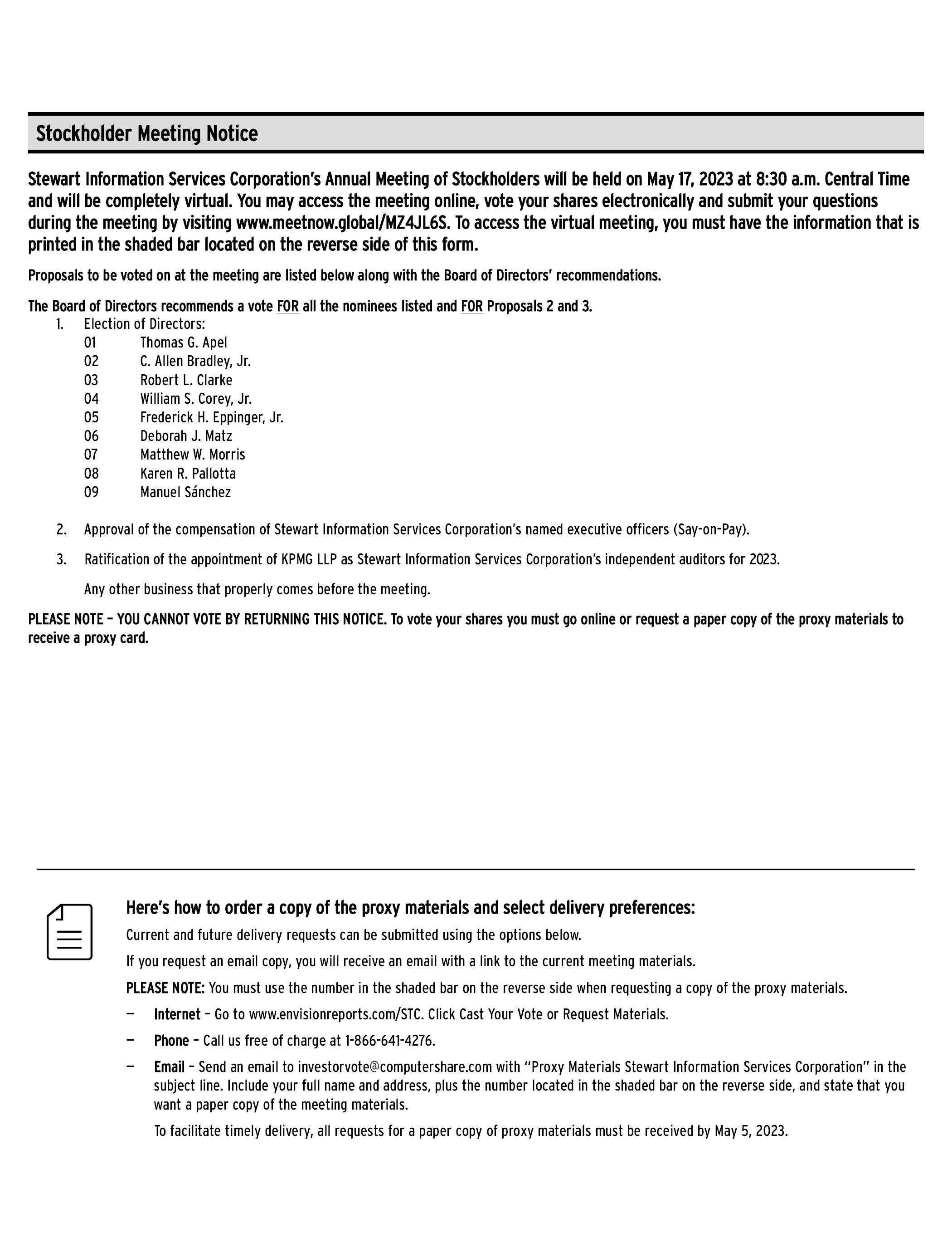 Stockholder Meeting Notice Stewart Information Services Corporation’s Annual Meeting of Stockholders will be held on May 17, 2023 at 8:30 a.m. Central Time and will be completely virtual. You may access the meeting online, vote your shares electronically and submit your questions during the meeting by visiting www.meetnow.global/MZ4JL6S. To access the virtual meeting, you must have the information that is printed in the shaded bar located on the reverse side of this form. Proposals to be voted on at the meeting are listed below along with the Board of Directors’ recommendations. The Board of Directors recommends a vote FOR all the nominees listed and FOR Proposals 2 and 3. 1. Election of Directors: 01 Thomas G. Apel 02 C. Allen Bradley, Jr. 03 Robert L. Clarke 04 William S. Corey, Jr. 05 Frederick H. Eppinger, Jr. 06 Deborah J. Matz 07 Matthew W. Morris 08 Karen R. Pallotta 09 Manuel Sánchez 2. Approval of the compensation of Stewart Information Services Corporation’s named executive officers (Say-on-Pay). 3. Ratification of the appointment of KPMG LLP as Stewart Information Services Corporation’s independent auditors for 2023. Any other business that properly comes before the meeting. PLEASE NOTE YOU CANNOT VOTE BY RETURNING THIS NOTICE. To vote your shares you must go online or request a paper copy of the proxy materials to receive a proxy card. Here’s how to order a copy of the proxy materials and select delivery preferences: Current and future delivery requests can be submitted using the options below. If you request an email copy, you will receive an email with a link to the current meeting materials. PLEASE NOTE: You must use the number in the shaded bar on the reverse side when requesting a copy of the proxy materials. Internet Go to www.envisionreports.com/STC. Click Cast Your Vote or Request Materials. Phone Call us free of charge at 1-866-641-4276. Email Send an email to investorvote@computershare.com with “Proxy Materials Stewart Information Services Corporation” in the subject line. Include your full name and address, plus the number located in the shaded bar on the reverse side, and state that you want a paper copy of the meeting materials. To facilitate timely delivery, all requests for a paper copy of proxy materials must be received by May 5, 2023.
