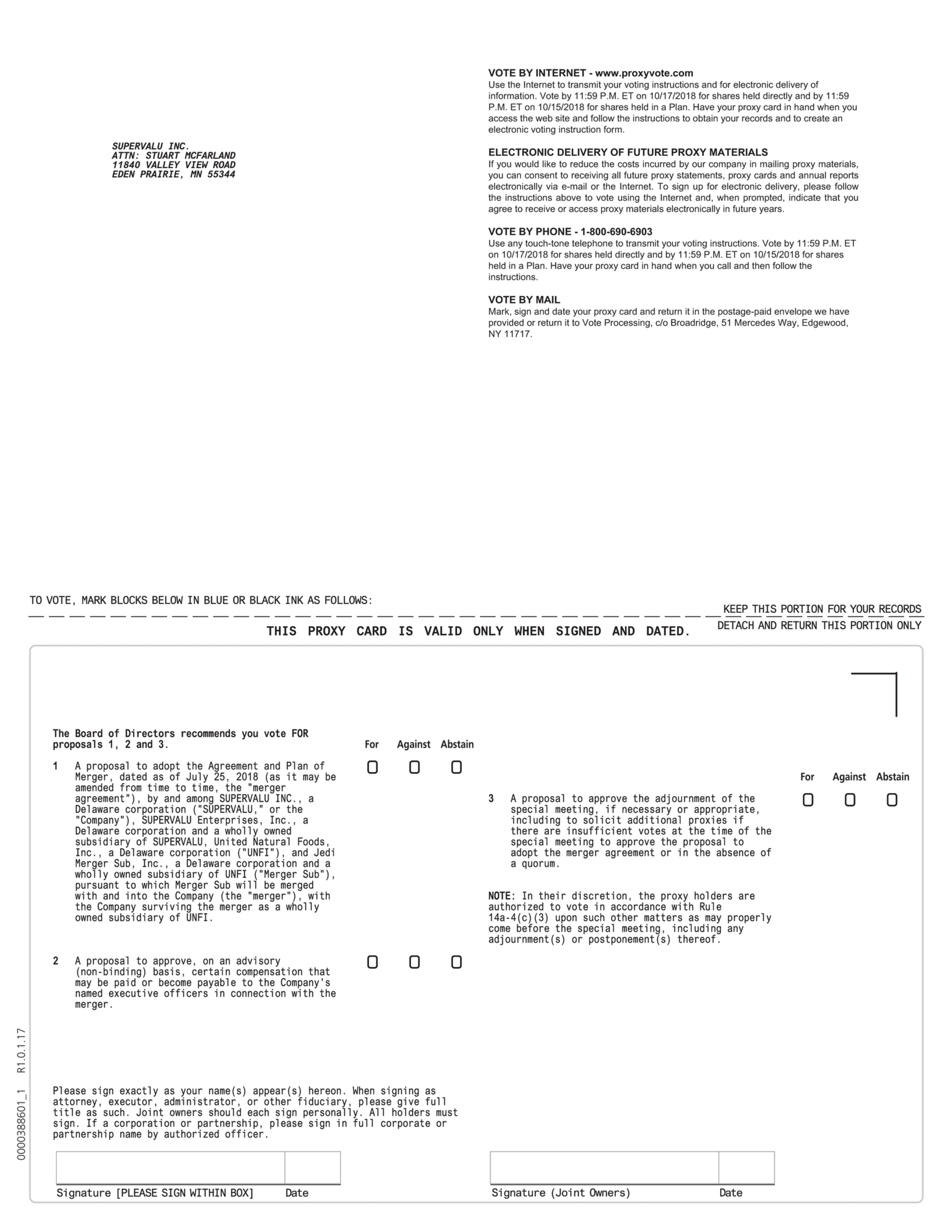 | 1. | to adopt the Agreement and Plan of Merger (as it may be amended from time to time, the “merger agreement”), dated as of July 25, 2018, by and among SUPERVALU, SUPERVALU Enterprises, Inc., a Delaware corporation and a wholly owned subsidiary of SUPERVALU (“SUPERVALU Enterprises”), United Natural Foods, Inc., a Delaware corporation (“UNFI”), and Jedi Merger Sub, Inc., a Delaware corporation and a wholly owned subsidiary of UNFI (“Merger Sub”), pursuant to which Merger Sub will be merged with and into the Company (as defined below) (the “merger”); |