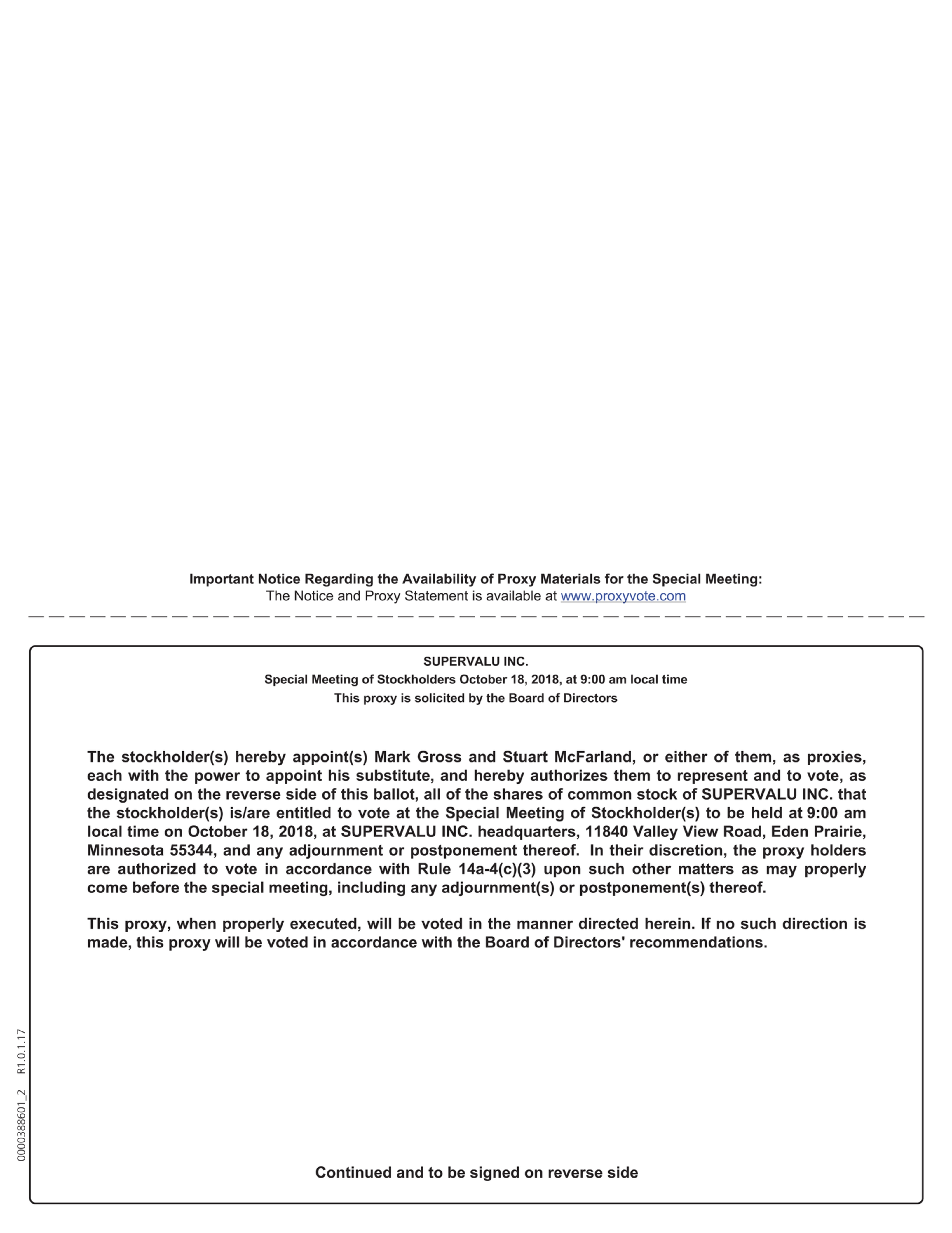 NOTICE IS HEREBY GIVEN that a Special Meeting of the Stockholders of SUPERVALU INC., a Delaware corporation (“SUPERVALU,” the “Company,” “we,” “our” or “us”), will be held at SUPERVALU INC. headquarters, 11840 Valley View Road, Eden Prairie, MN 55344, on Thursday, October 18, 2018, at 9:00 am local time (such meeting, including any adjournment or postponement thereof, the “special meeting”), to consider and vote upon the following proposals: