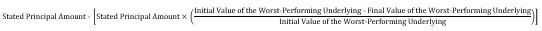 If the Notes are not called prior to maturity and the Final Value of the Worst-Performing Underlying is less than its Threshold Value, you will receive for each Note that you hold a Payment at Maturity that is less than the Stated Principal Amount of each Note that will equal:
