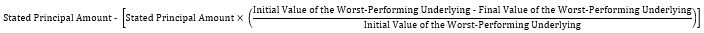 If the Notes are not called prior to maturity and the Final Value of the Worst-Performing Underlying is less than its Threshold Value, you will receive for each Note that you hold a Payment at Maturity that is less than the Stated Principal Amount of each Note that will equal: