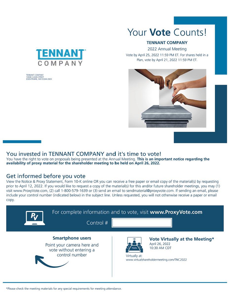 Your Vote Counts! TENNANT COMPANY 2022 Annual Meeting Vote by April 25, 2022 11:59 PM ET. For shares held in a Plan, vote by April 21, 2022 11:59 PM ET.TENNANT COMPANY 10400 CLEAN STREET EDEN PRAIRIE, MN 55344-2650You invested in TENNANT COMPANY and it's time to vote! You have the right to vote on proposals being presented at the Annual Meeting. This is an important notice regarding the availability of proxy material for the shareholder meeting to be held on April 26, 2022.Get informed before you vote View the Notice & Proxy Statement, Form 10-K online OR you can receive a free paper or email copy of the material(s) by requesting prior to April 12, 2022. If you would like to request a copy of the material(s) for this and/or future shareholder meetings, you may (1) visit www.ProxyVote.com, (2) call 1-800-579-1639 or (3) send an email to sendmaterial@proxyvote.com. If sending an email, please include your control number (indicated below) in the subject line. Unless requested, you will not otherwise receive a paper or email copy.Smartphone users Point your camera here and vote without entering a I numberVirtually at:Vote Virtually at the Meeting* April 26, 2022 10:30 AM CDTwww.virtualshareholdermeeting.com/TNC2022*Please check the meeting materials for any special requirements for meeting attendance.