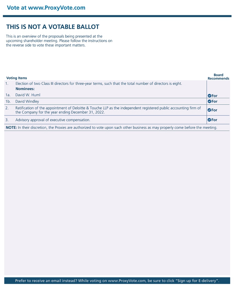 Vote at www.ProxyVote.comTHIS IS NOT A VOTABLE BALLOT This is an overview of the proposals being presented at the upcoming shareholder meeting. Please follow the instructions on the reverse side to vote these important matters.Voting Items 1. Election of two Class Ill directors for three-year terms, such that the total number of directors is eight. Nominees: 1a. David W. HurniBoard Recommends1b. David Windley 0 For2. Ratification of the appointment of Deloitte & Touche LLP as the independent registered public accounting firm of the Company for the year ending December 31, 2022.3. Advisory approval of executive compensation.O For0 ForNOTE: In their discretion, the Proxies are authorized to vote upon such other business as may properly come before the meeting.